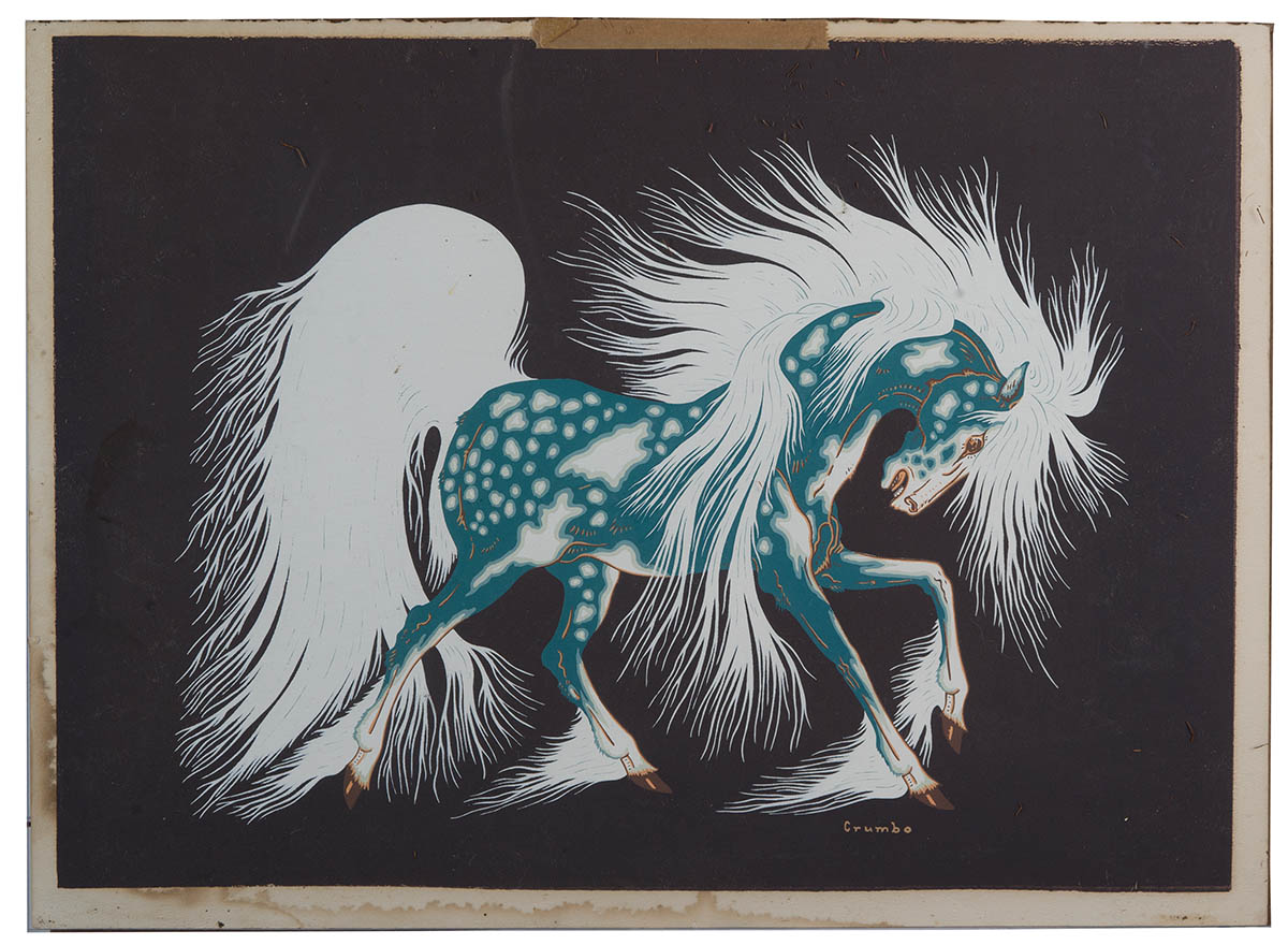 Woodrow Wilson Crumbo (Woody Crumbo, 1912-1989, Potawatomi Nation), print, “The Blue Spirit Horse”, signed l.r. “Crumbo”, minor water stain at margin in the center and at left side, tape at top, (note: a very desirable Woody Crumbo print showing a Blue Appaloosa Spirit), 15″ x 20″.