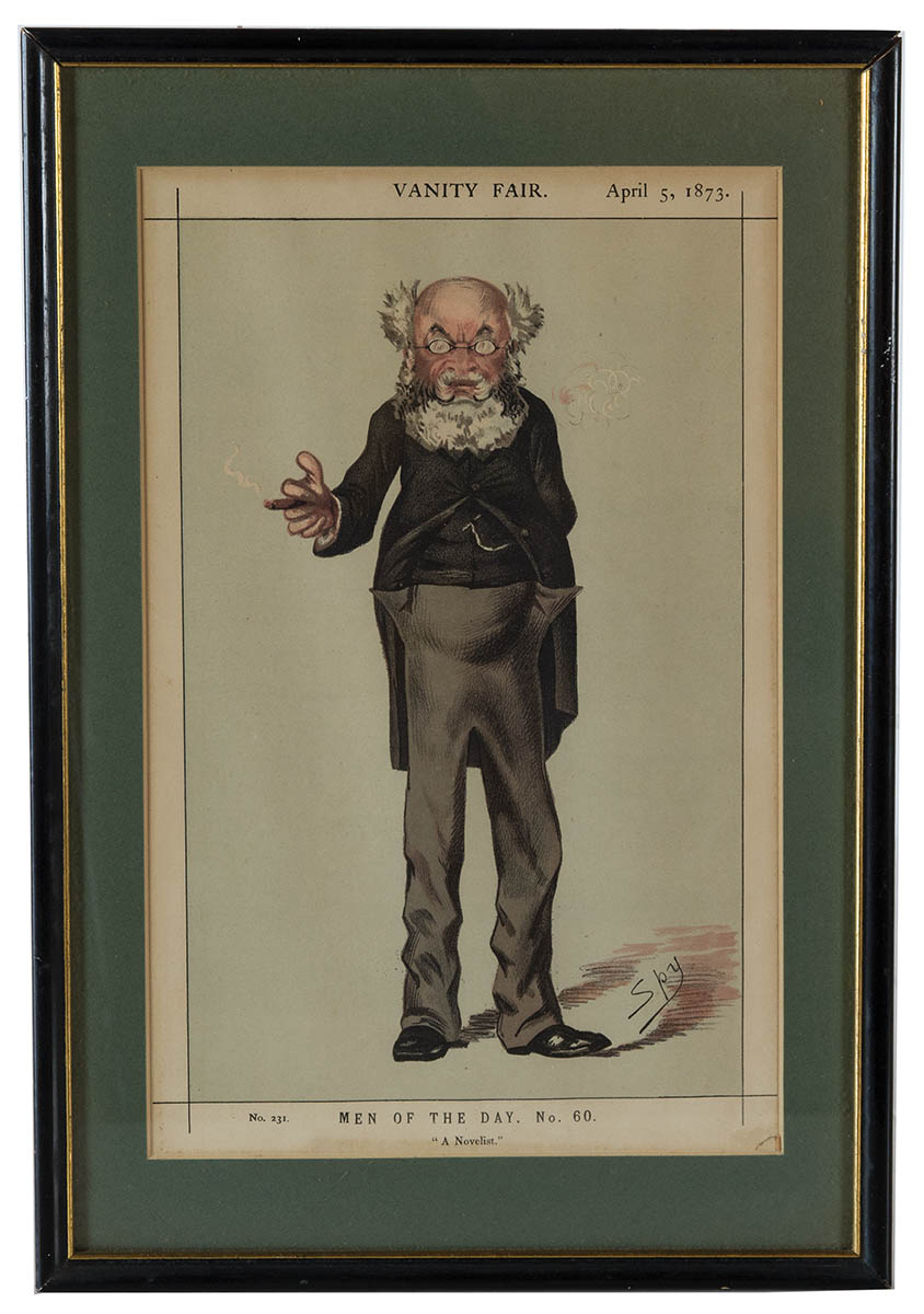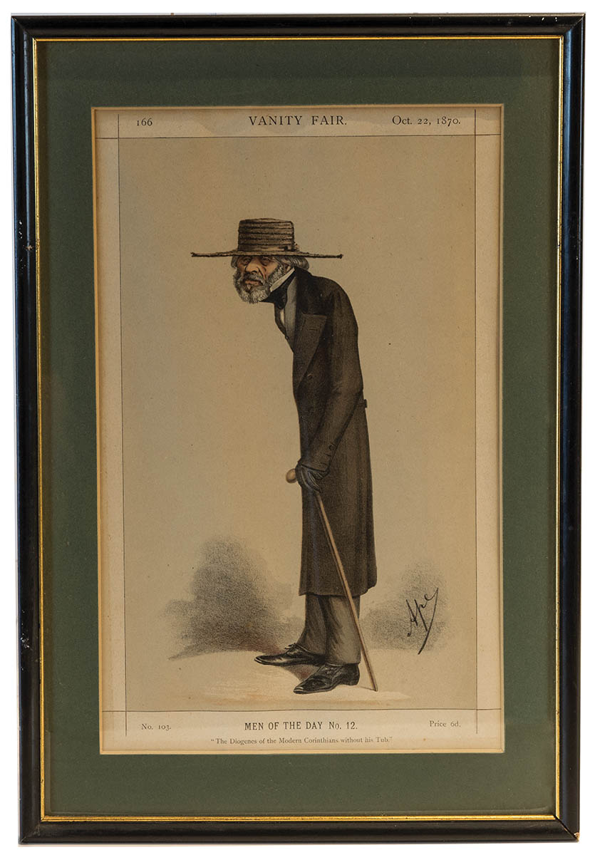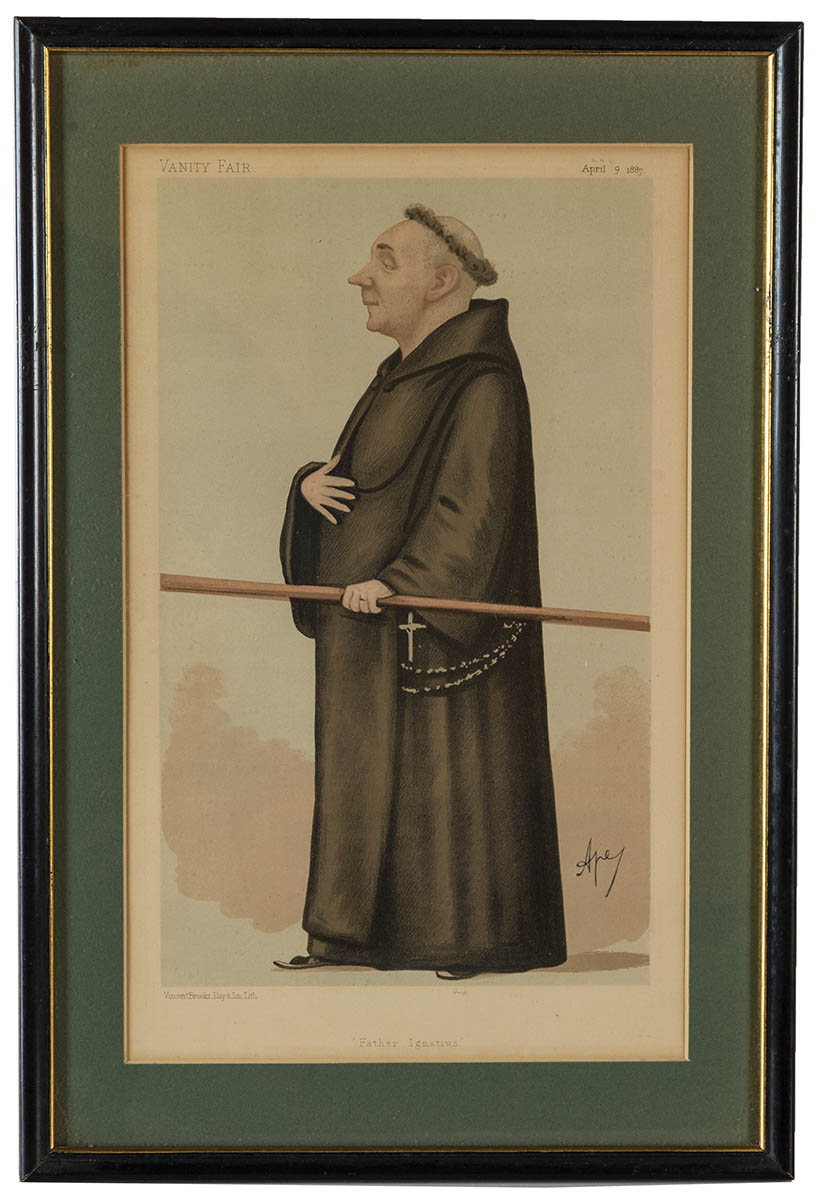 Matted and framed, colored caricature lithograph etchings, No. 231 Men of the Day No. 60, “a Novelist”, Father Ignatius, April 9, 1887, Men of the Day No. 12, “The Diogenes of the Modern Corinthians without his Tub”, No. 103, Oct 22, 1870, No. 142 Men of the Day, No. 28 “The Poet Laureate”, July 22, 1871, 14″ x 8″ (sight).