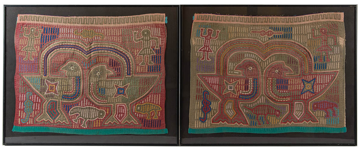 Two similar 20th c. Panamanian molas, human figures, birds, snakes.
