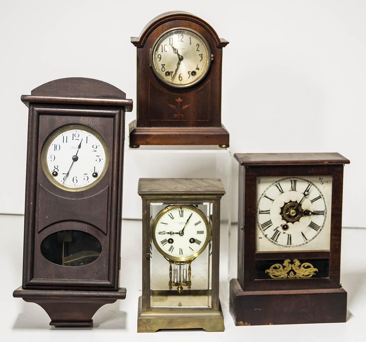 “Ansonia”, time and strike, with brass pendulum bob, made to hang, 18″ l; Brass and glass with mercury pendulum, time and strike, 10″ h; Seth Thomas time and strike with pendulum, mahogany inlaid case, 10″ h; “E.M. Watch Co.” timepiece, Thirty-Hour Timepiece, with brass bob pendulum, 12″ h; from the Historical Mordecai Lincoln House, Scituate, MA.