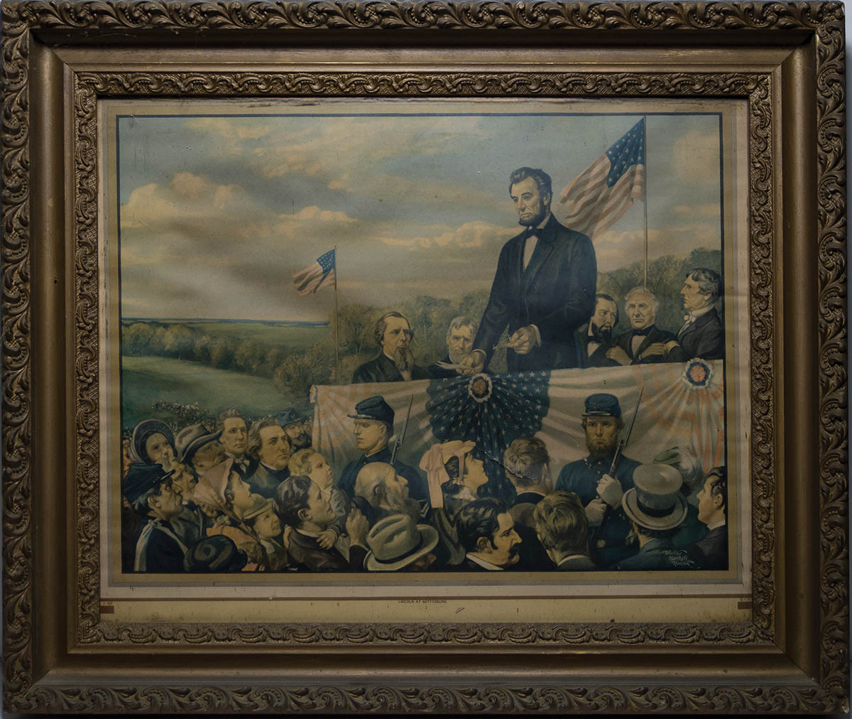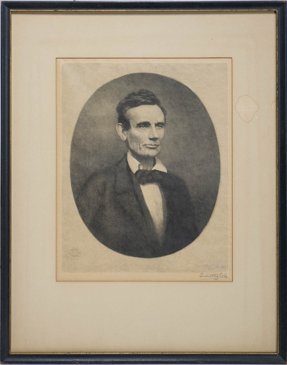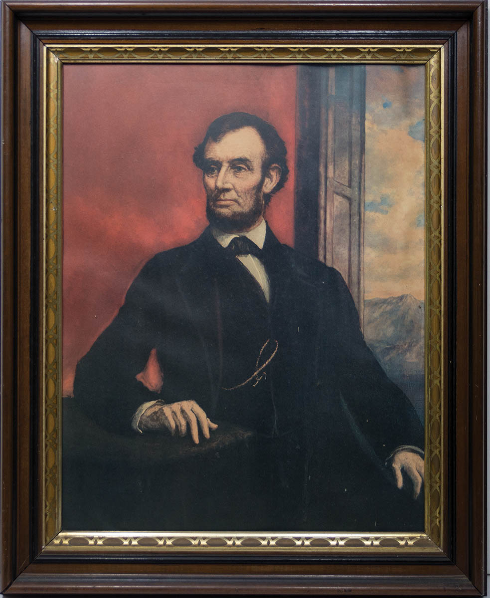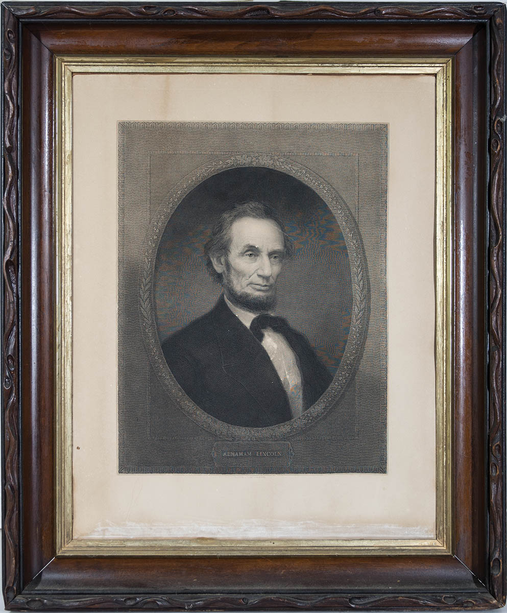 Hand-colored lithograph, “Lincoln at Gettysburg”, with soldiers and onlookers, “Walter Haskell Hinton”, toned and small tears, 18″ x 23″ (sight); Oval print of three-quarter bust of Lincoln without beard, pencil signed “Timothy Cole”, 1928; Oval in a square, three-quarter bust of Lincoln with beard, (scratches), carved walnut frame, 27″ x 21 1/2″ (sight), 35″ x 30″ (frame); 20th c. print of Lincoln looking left, 19th c. frame with gilt liner, 28″ x 23″; from the Historical Mordecai Lincoln House, Scituate, MA.