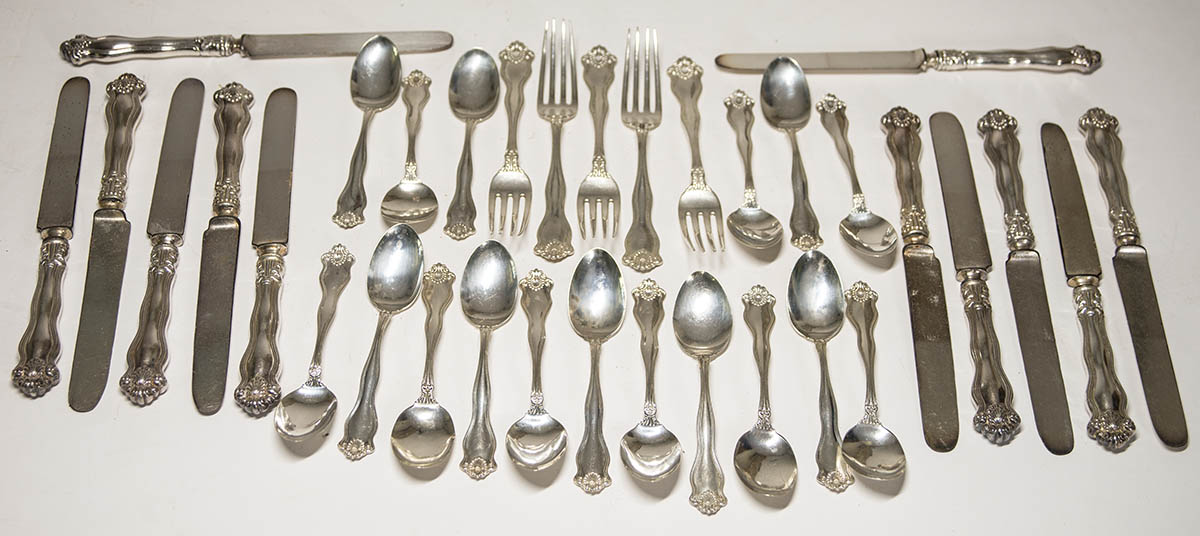 Collection of matching sterling silver flatware, 12 knives (26.3 ozt), five forks (7.8 ozt), and 17 teaspoons (10.9 ozt); from the Historical Mordecai Lincoln House, Scituate, MA.