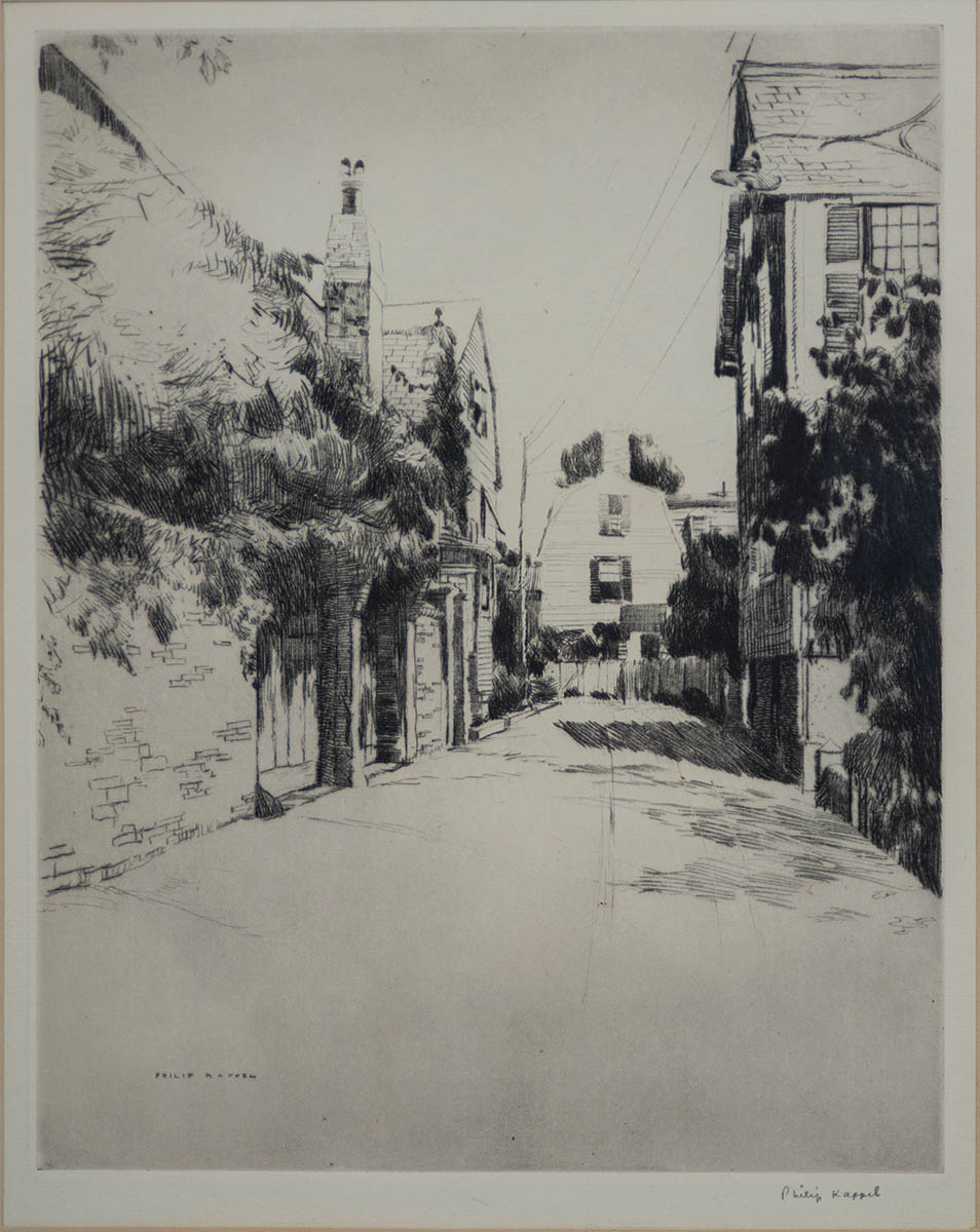 Drypoint etching on Japan paper, “Philip Kappel” (1901-1981), pencil signed and dated “1932”, “For Grace C. Batchelder, The Net Menders, Gloucester, Philip Kappel”, 10 1/2″ x 8 1/2″; Drypoint etching on Japan paper, pencil signed l.r. “Philip Kappel”, “Bott’s Court” street scene, Salem, MA, 10 3/4″ x 8 1/2″ (sight); both from the estate of John Brooks of Salem, Massachusetts.