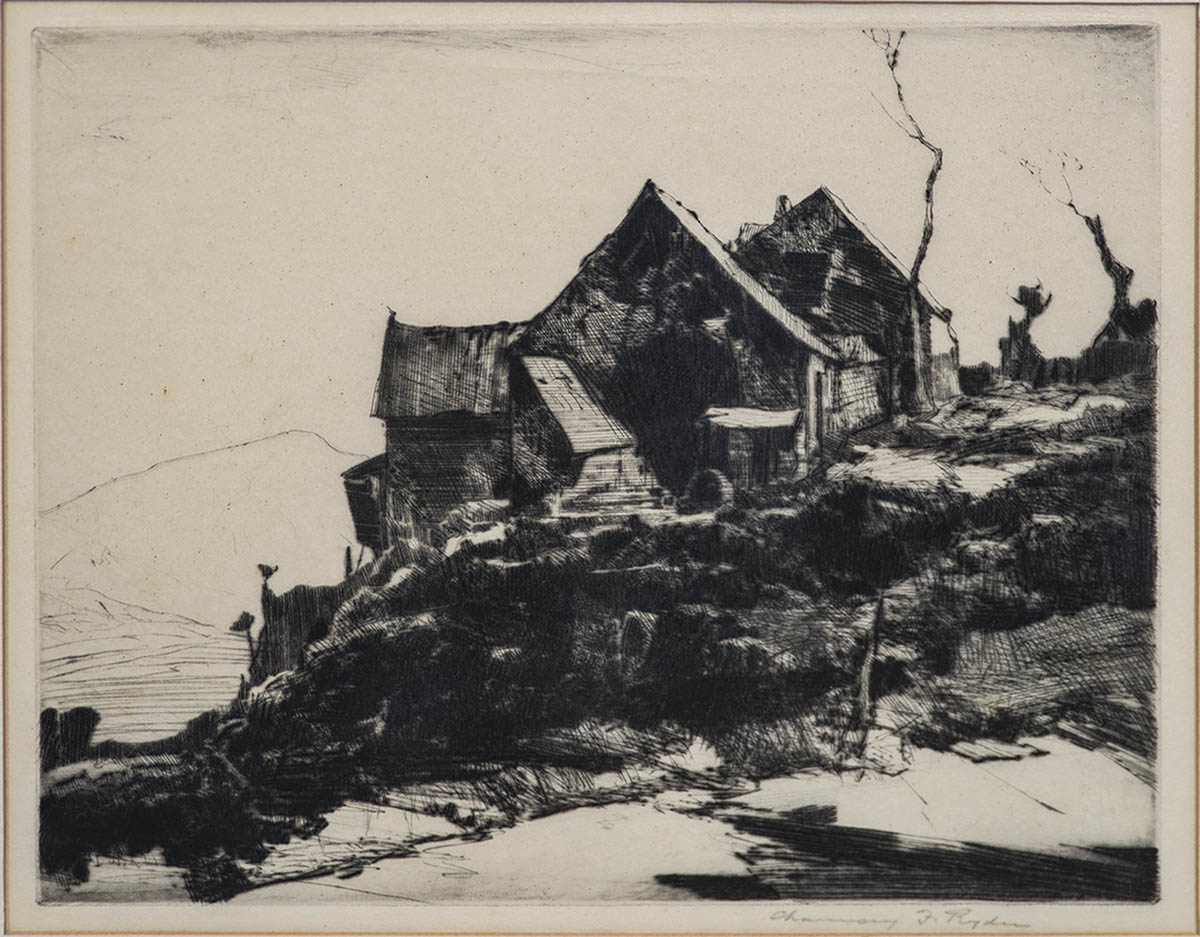 Linocut print on Japan paper, Donald F. Witherstine (1895-1961), “Old Houses, France”, signed l.r., 10 1/4″ x 8″; Drypoint etching, signed l.r., “The Old Farmhouse”, Chauncey F. Ryder (1868-1949), molded wood frame, 22″ x 17″.