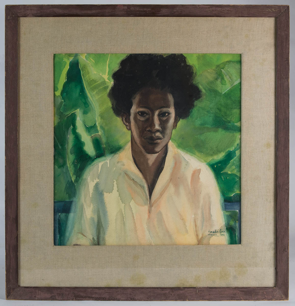 Framed and matted under glass, watercolor on paper, “A Sensitive Portrait” with banana leaves in background, signed l.r. “Alexander Geiss” and “Acapulco, Mex, 1/34.”, some mold spots, 15 1/2″ sq (sight), 24″ x 23″ (frame), (ex. Tony Geiss estate, NYC).