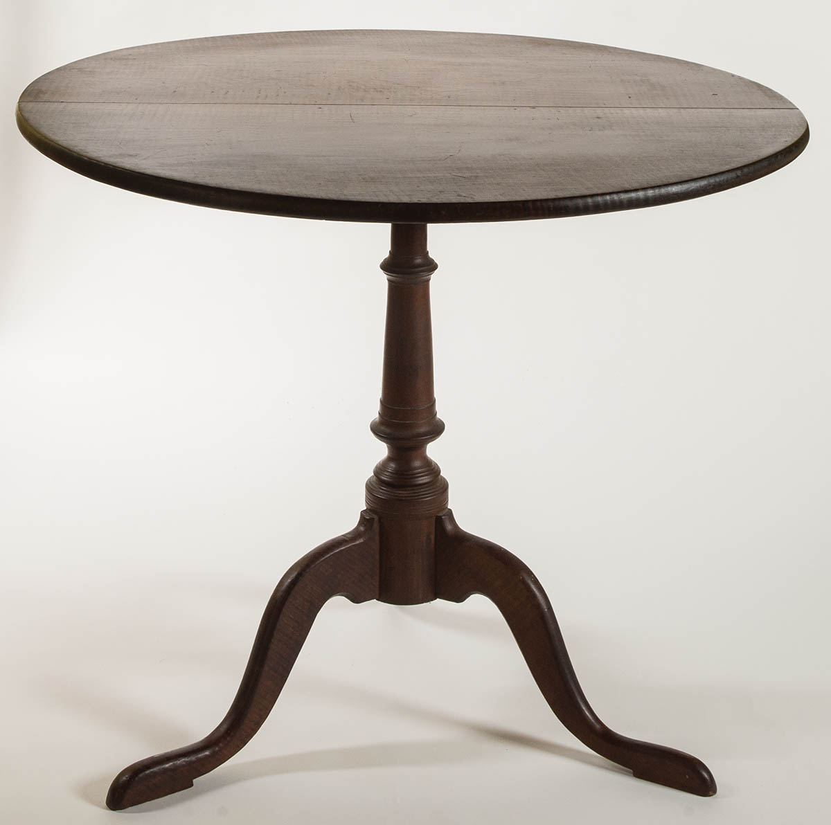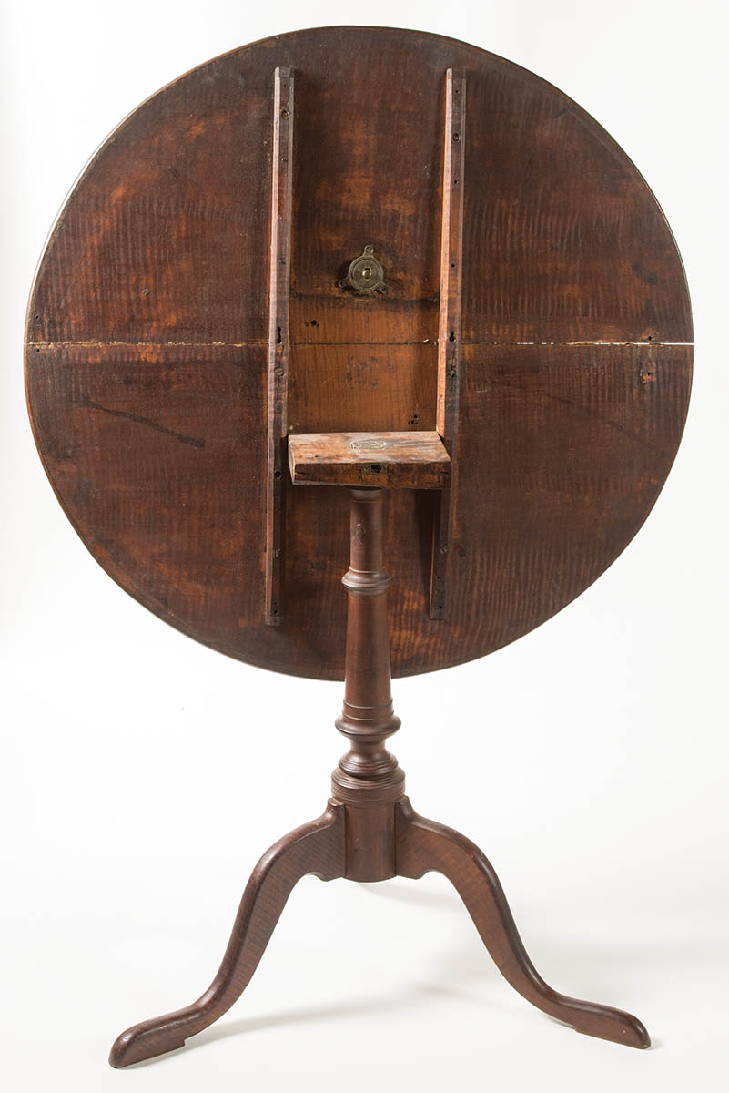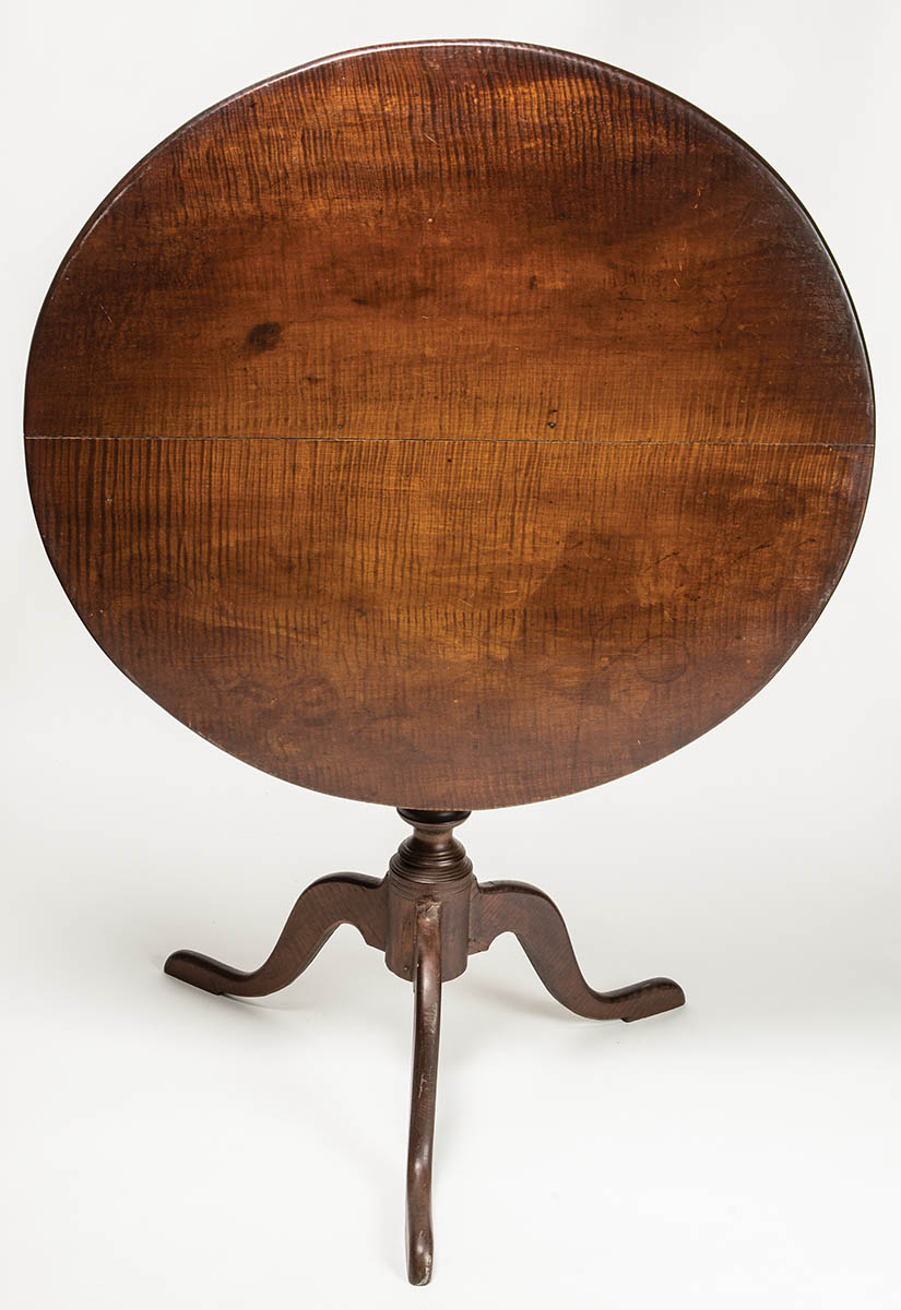 New England, Queen Anne, round tea table, two-board tiger maple top, with very fine matched grain, turned shaft, tiger maple shaped legs, good pads, excellent finish, 27 1/2″ h, 32″ dia (top).