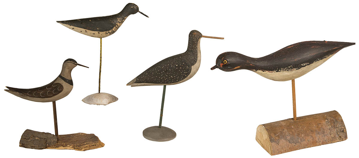 One on a clam shell, one signed “Brian Mitchell”, with copper tack eyes, on a split tree branch, 9″ l, (smal part of tail missing), two more with painted eyes.