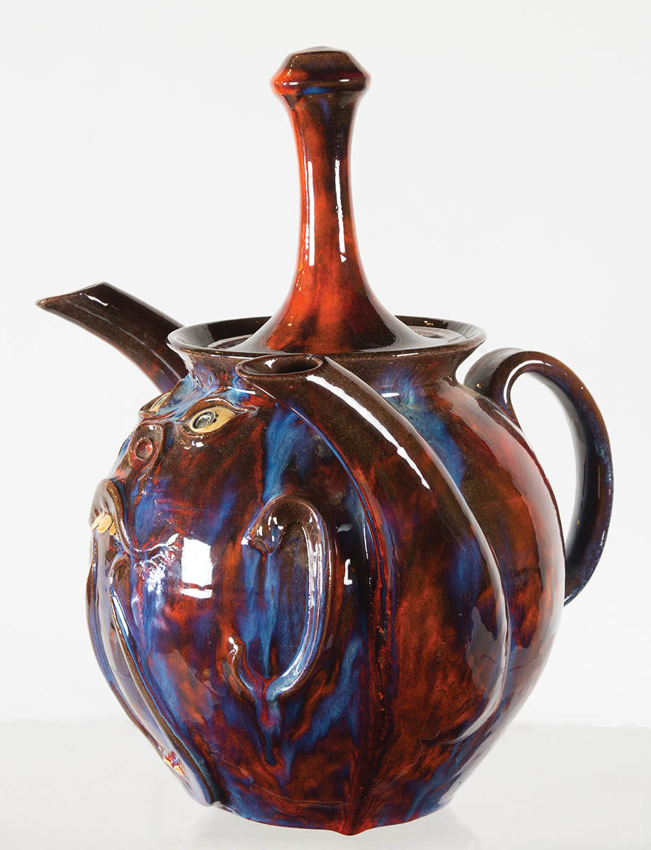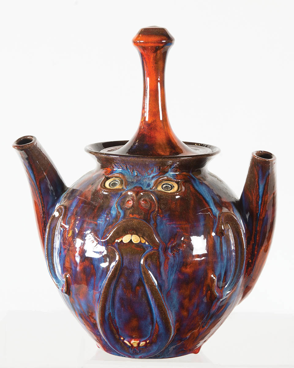 Unusual teapot by Roger Corn, “Folk Art Potter”, titled “Opera Personality Tea Kettle”, Lula, Ga, double spout, 12 1/2″ h (with lid).