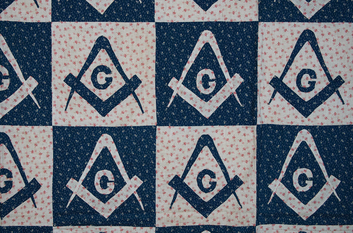 Masonic red leaf background, with blue and white alternating compass and square designs in 120 squares, 74″ x 88″.