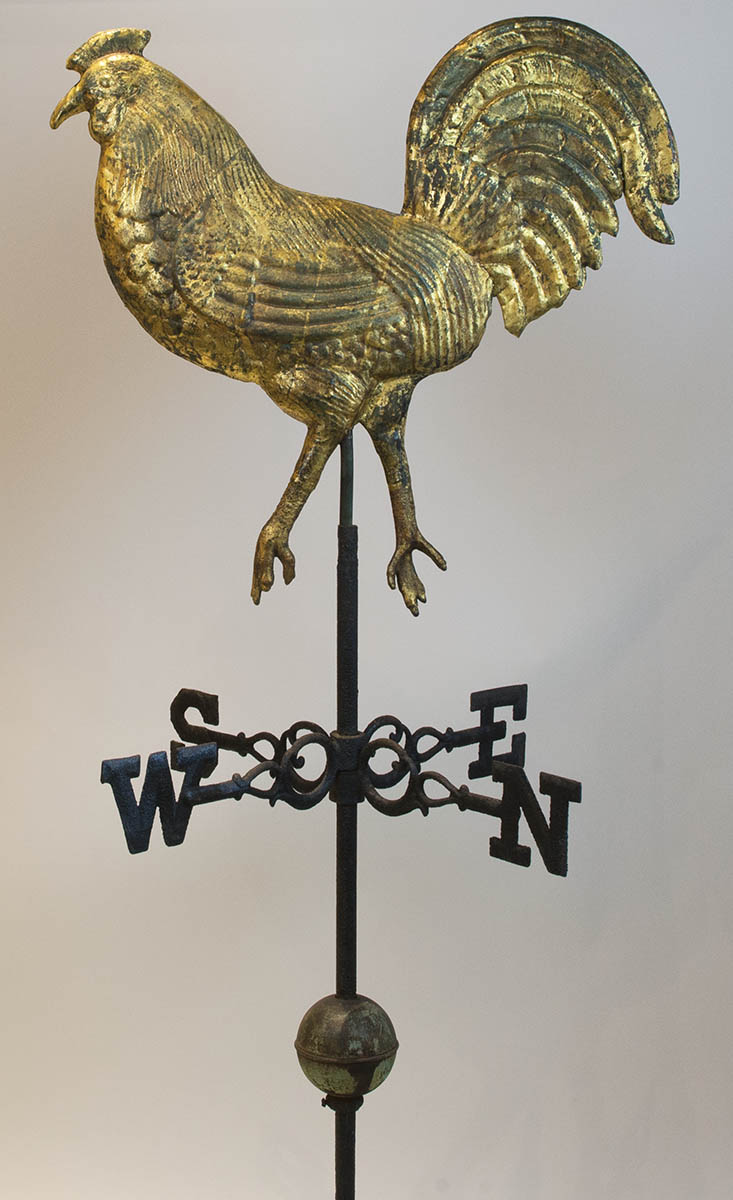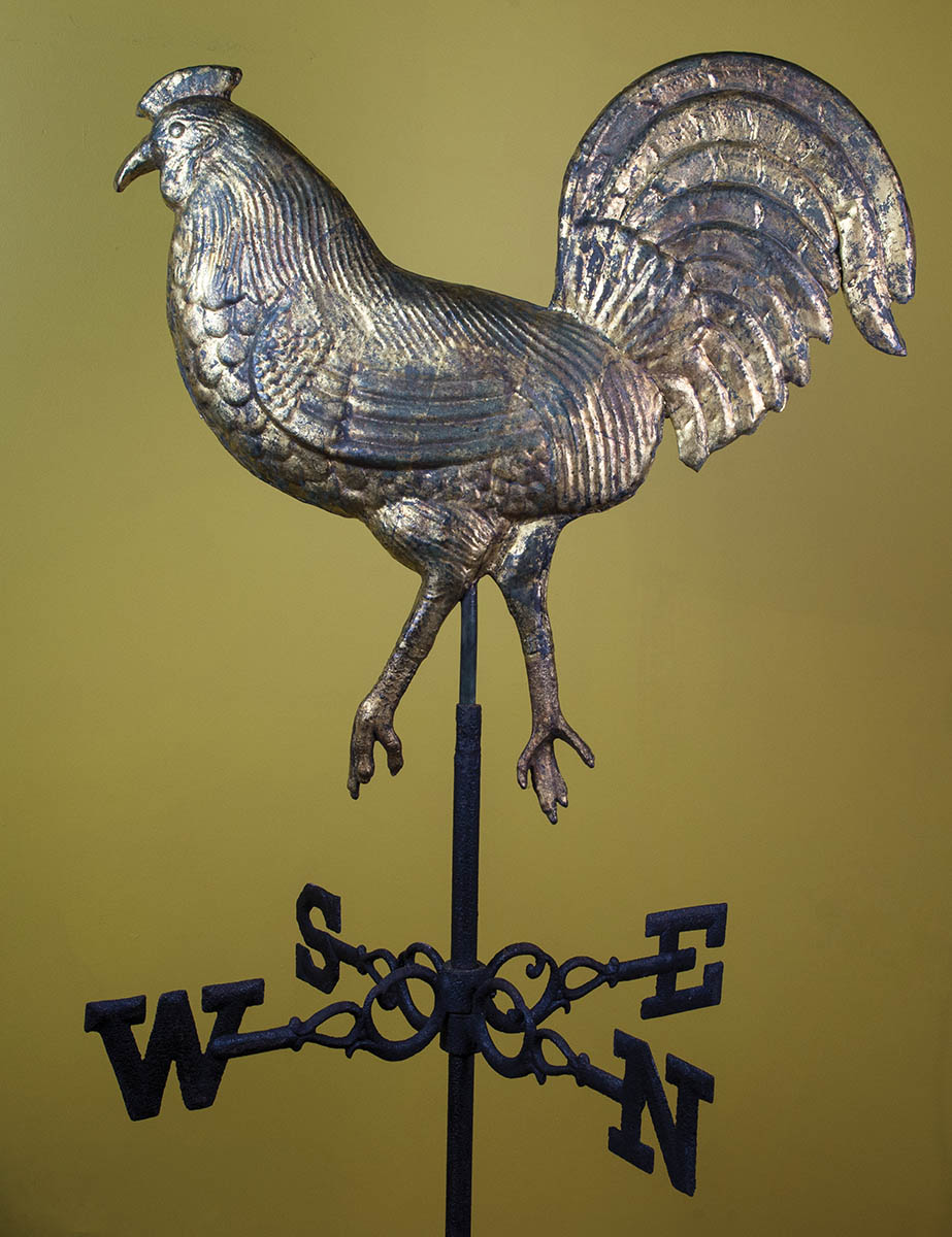 Second half 19th c., cast zinc legs, very fine old gilded surface, mounted on original iron shaft, with cast iron directionals and copper ball, overall excellent condition, rooster – 29″ h, 31″ l, 74″ h (on stand). [Note: Similar to Plates 1595 and 1604 in Treasury of American Design, Clarence P. Hornung, NY, Abrams.]