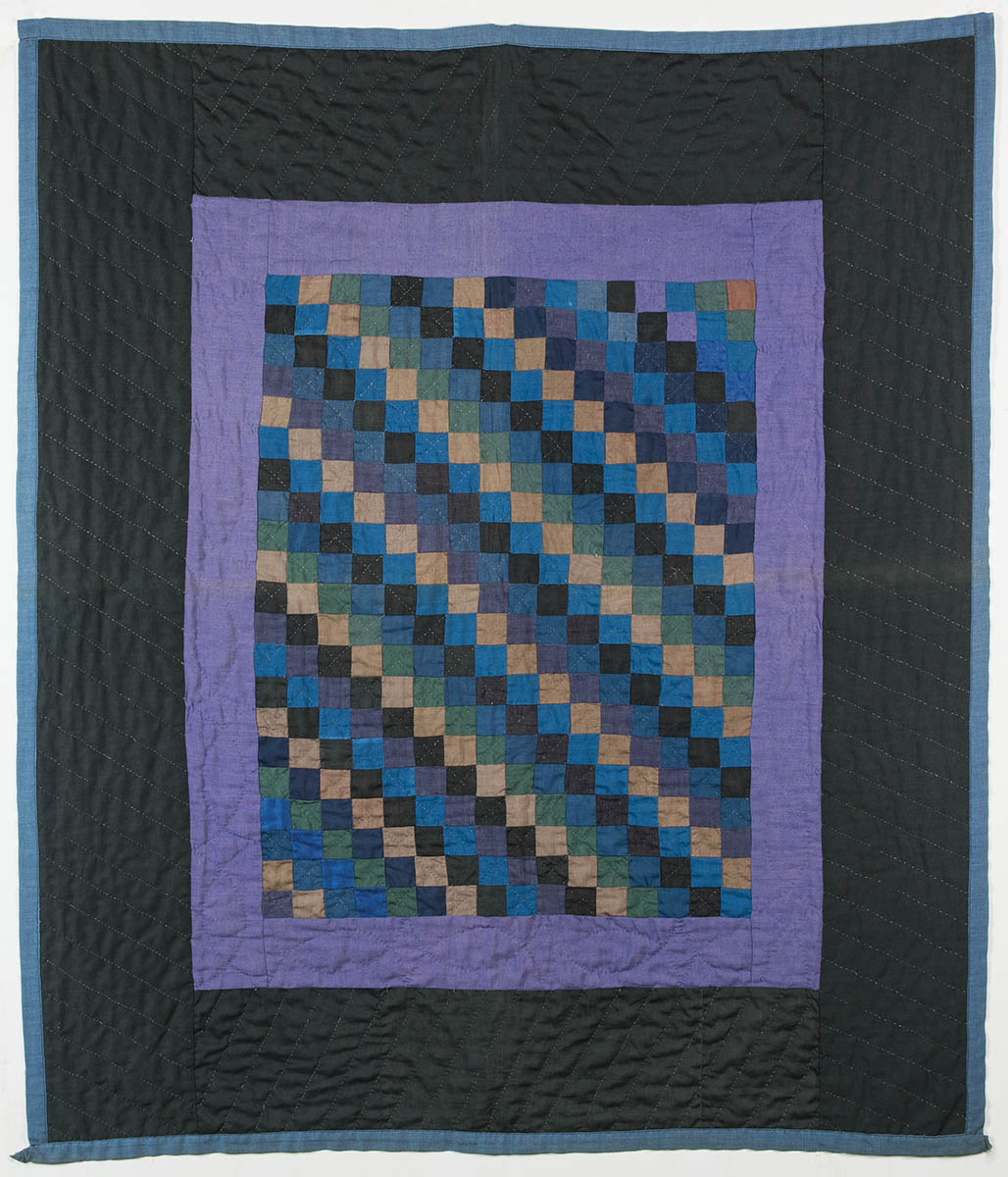 “One Patch”, diagonal diamonds in a light purple rectangle, blues, greens, black, light brown, blue back and edge, 36″ x 42″.