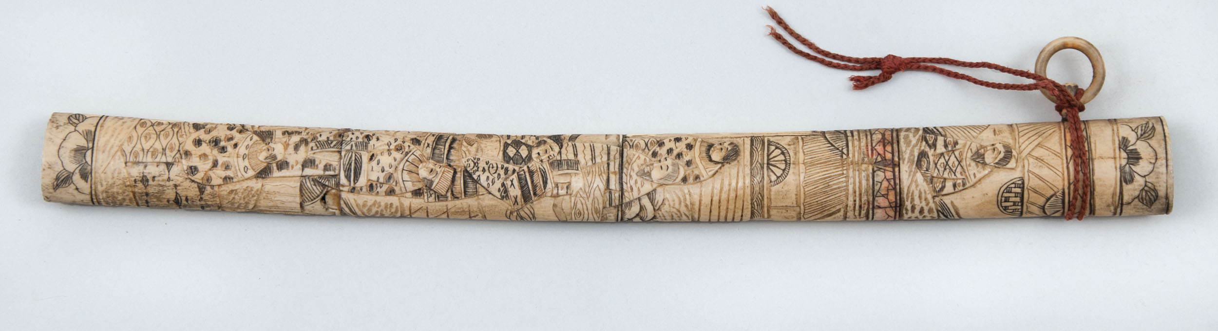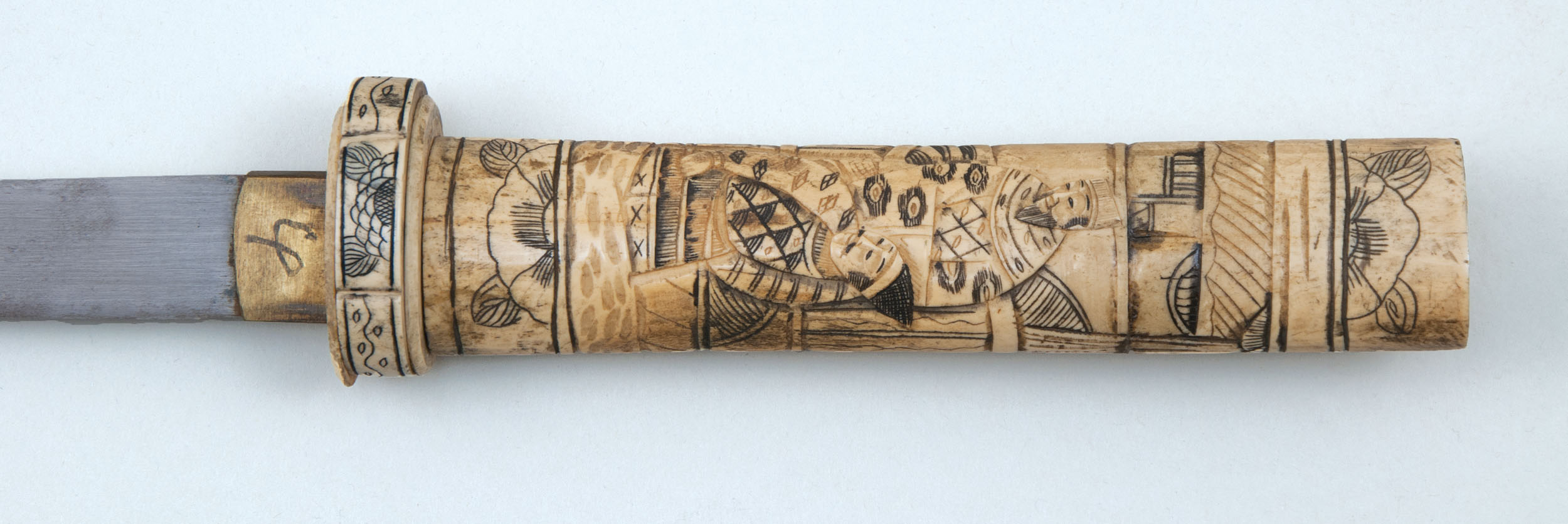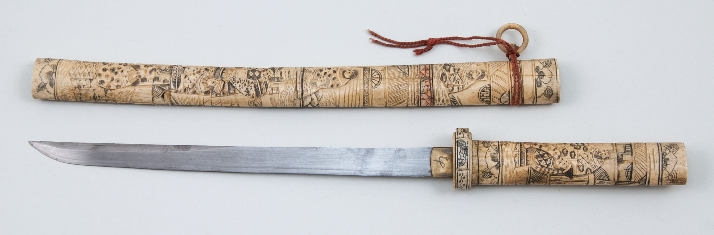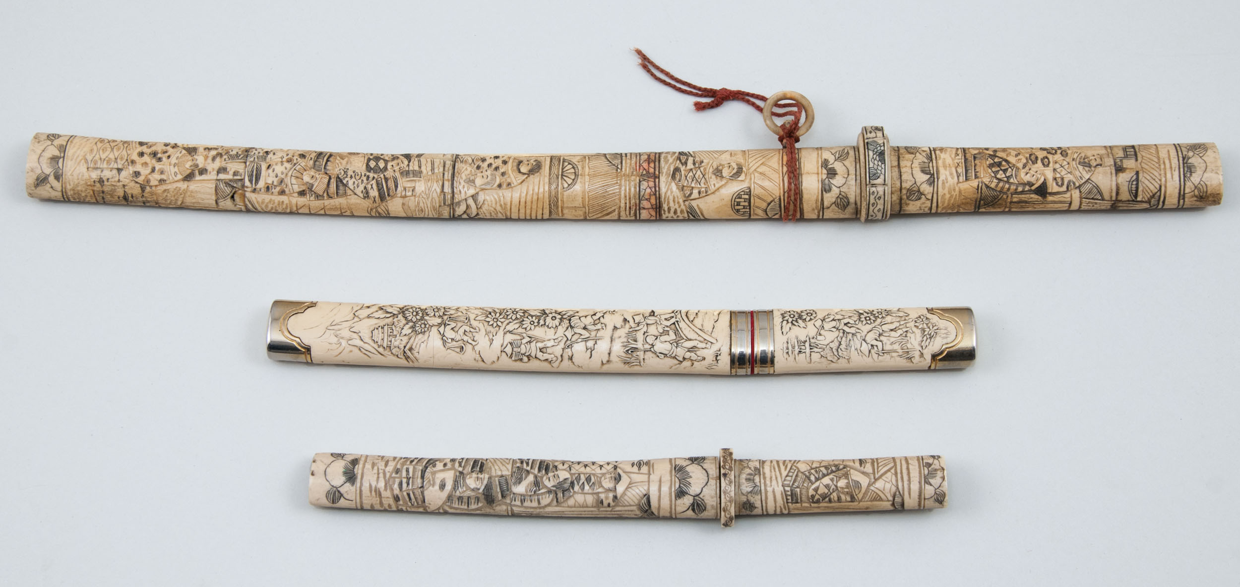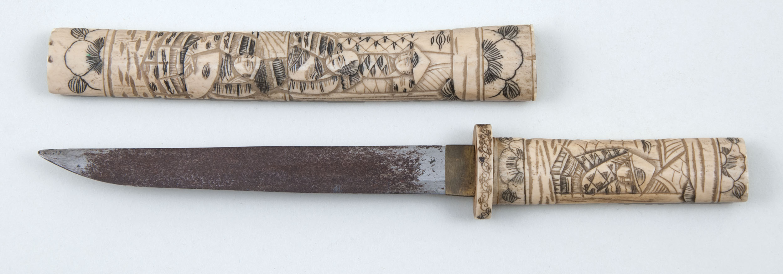 Similar carved bone mounts, #1) wakazashi and #2) tanto, both mounted in carved bone, design depicting Samurai, etc. 19th/20th c., some rust stains on blade. #3) Modern Aikuchi mounted tanto, various scenes in brass and composite relief.
