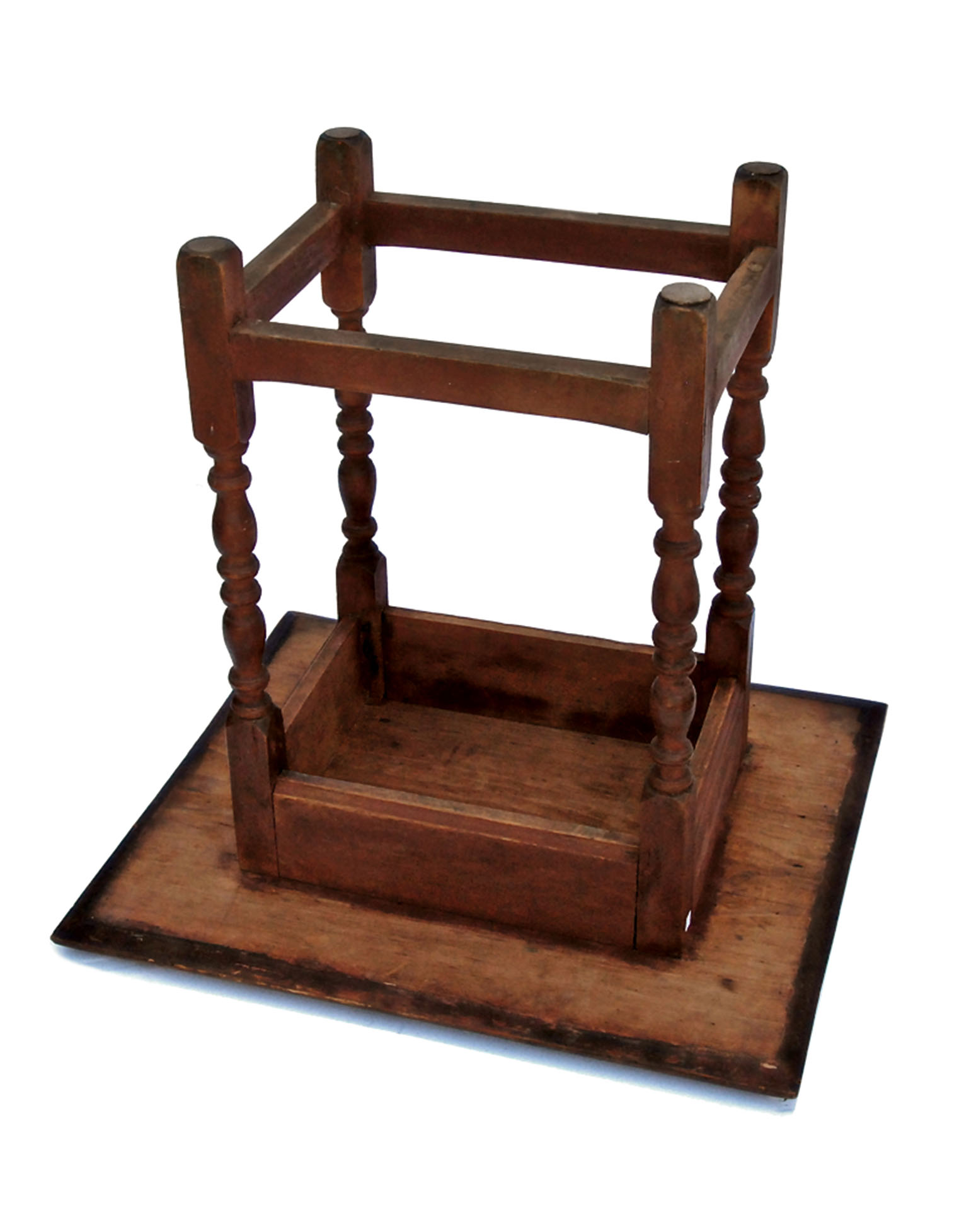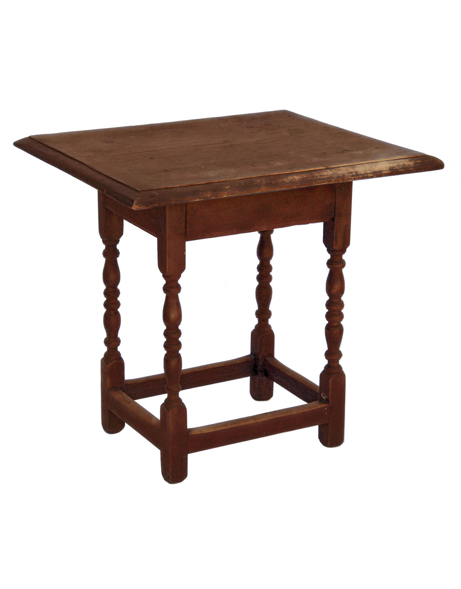 18th c. New England tavern table, maple base, one board pine top (probably an old replacement), turned legs, pegged box stretcher, 25″ h, 27″ w, 23″ d.