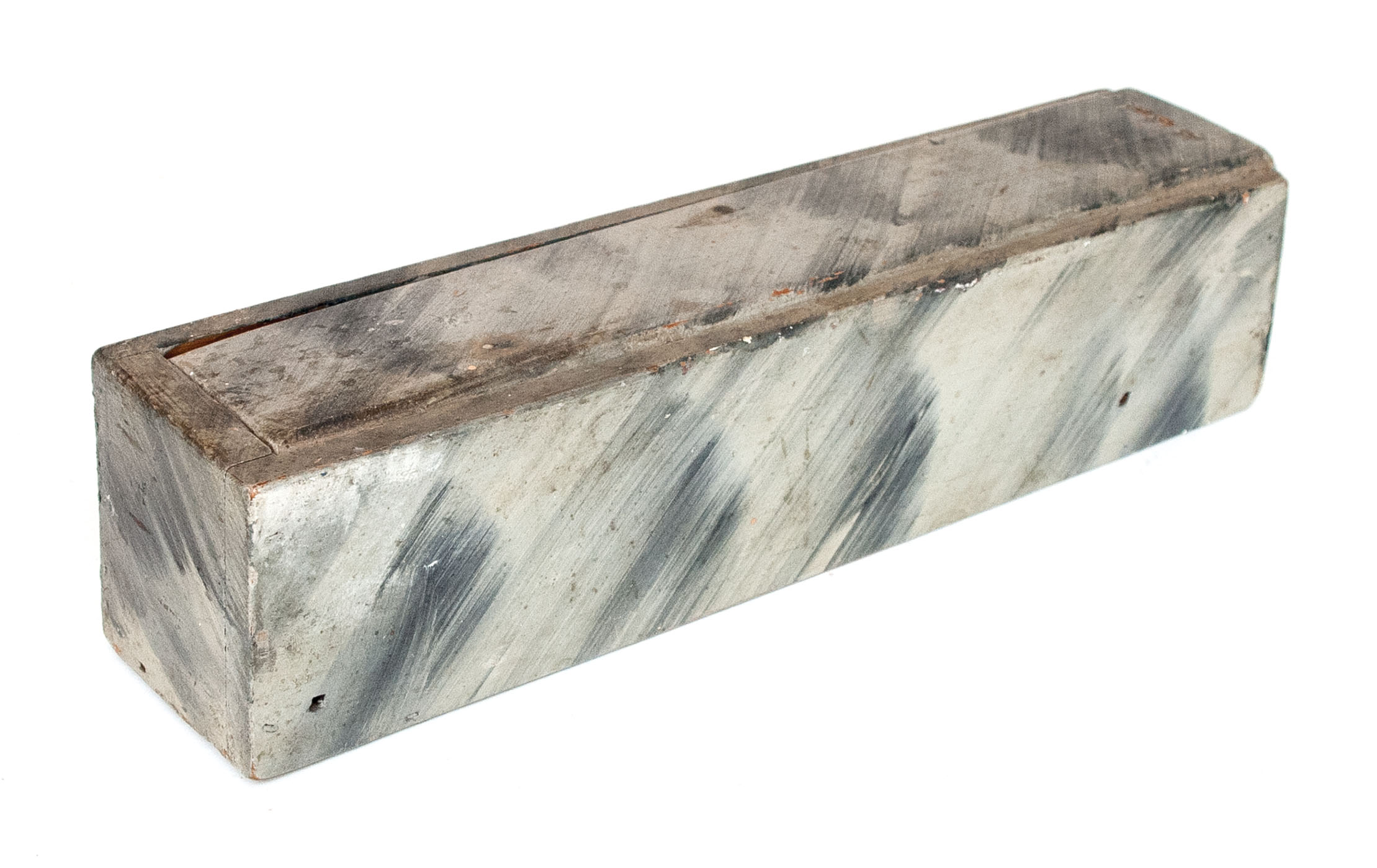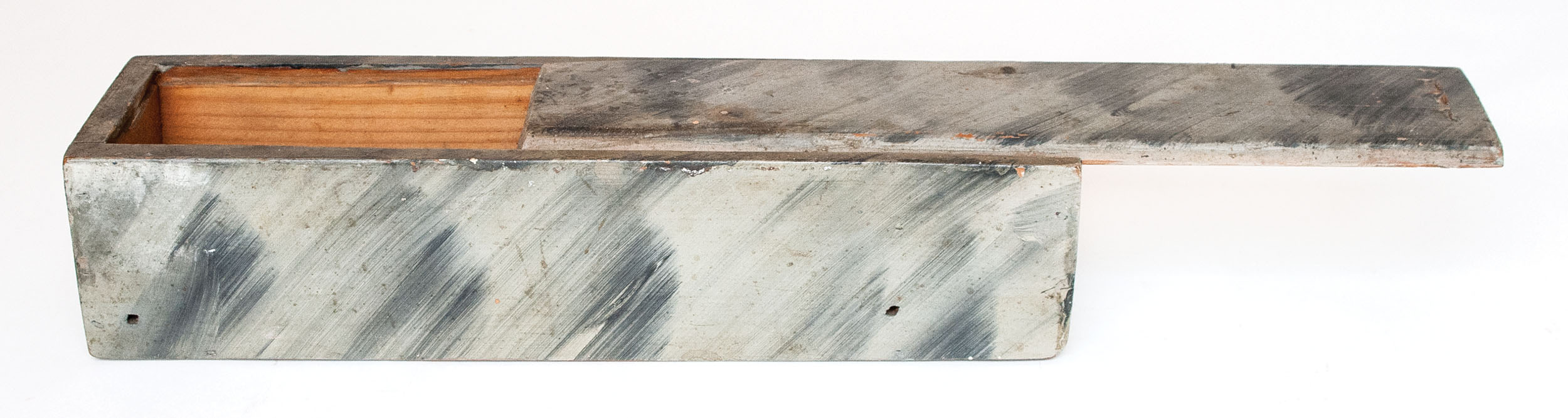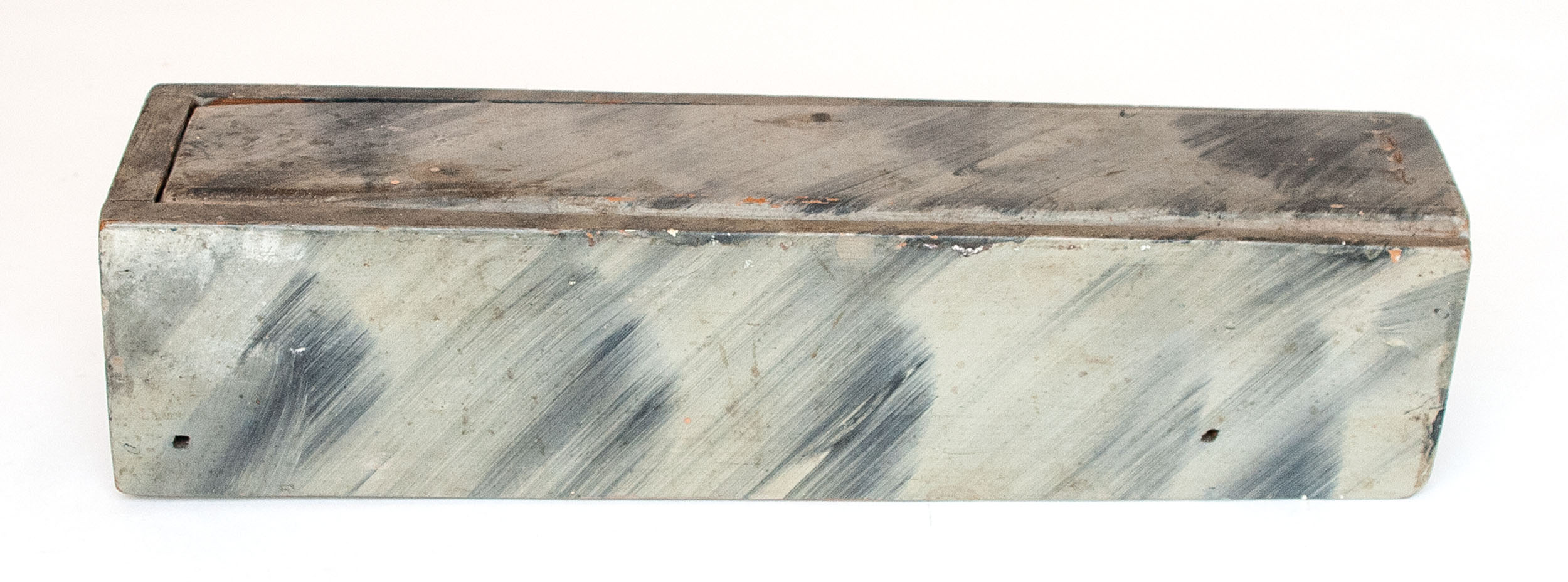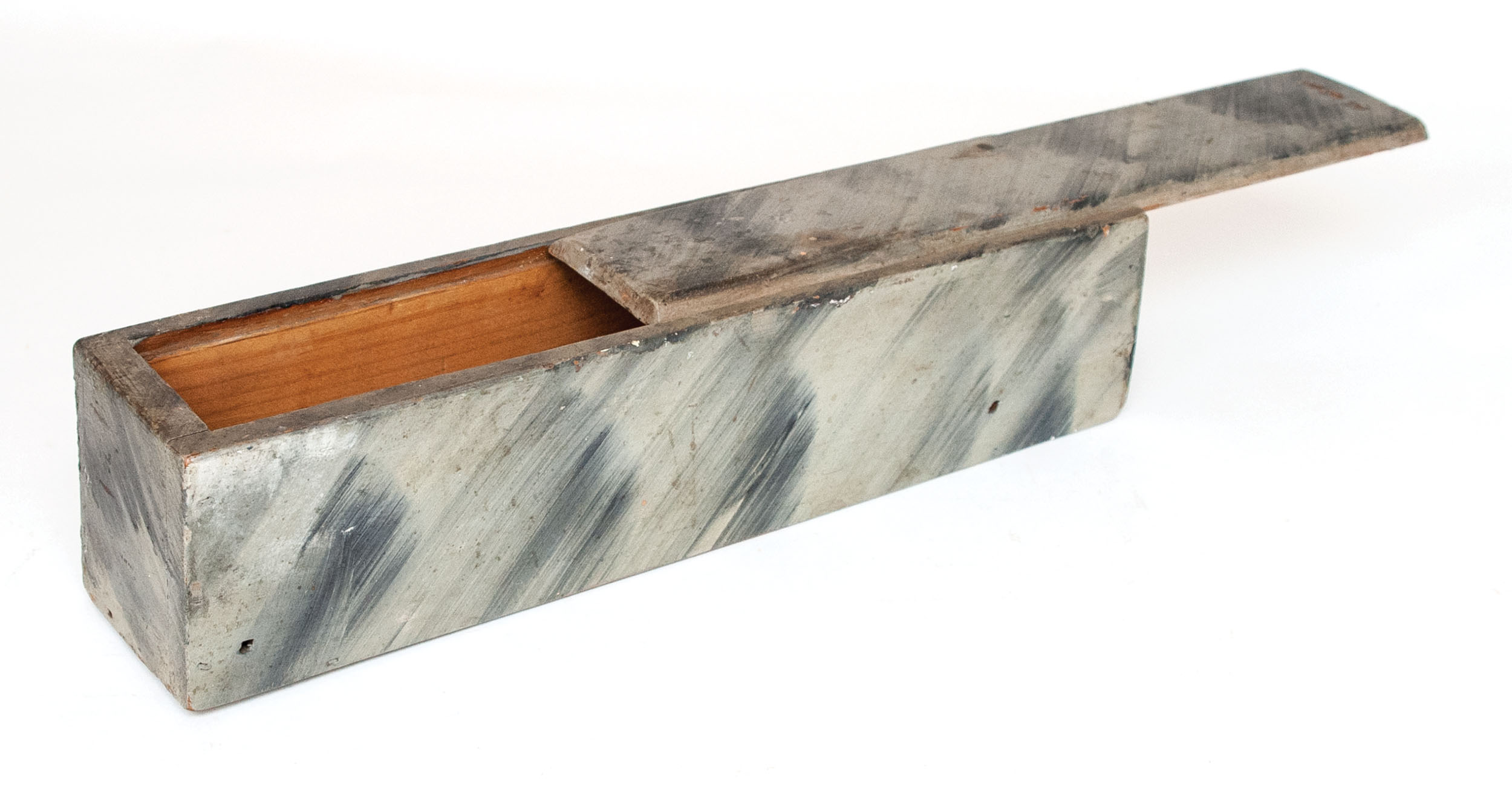 New England, grain painted, with dark gray on lighter gray diagonal brushed streaks, carved finger notches in lid, 3 3/8″ h, 14″ l, 3 1/2″ w.