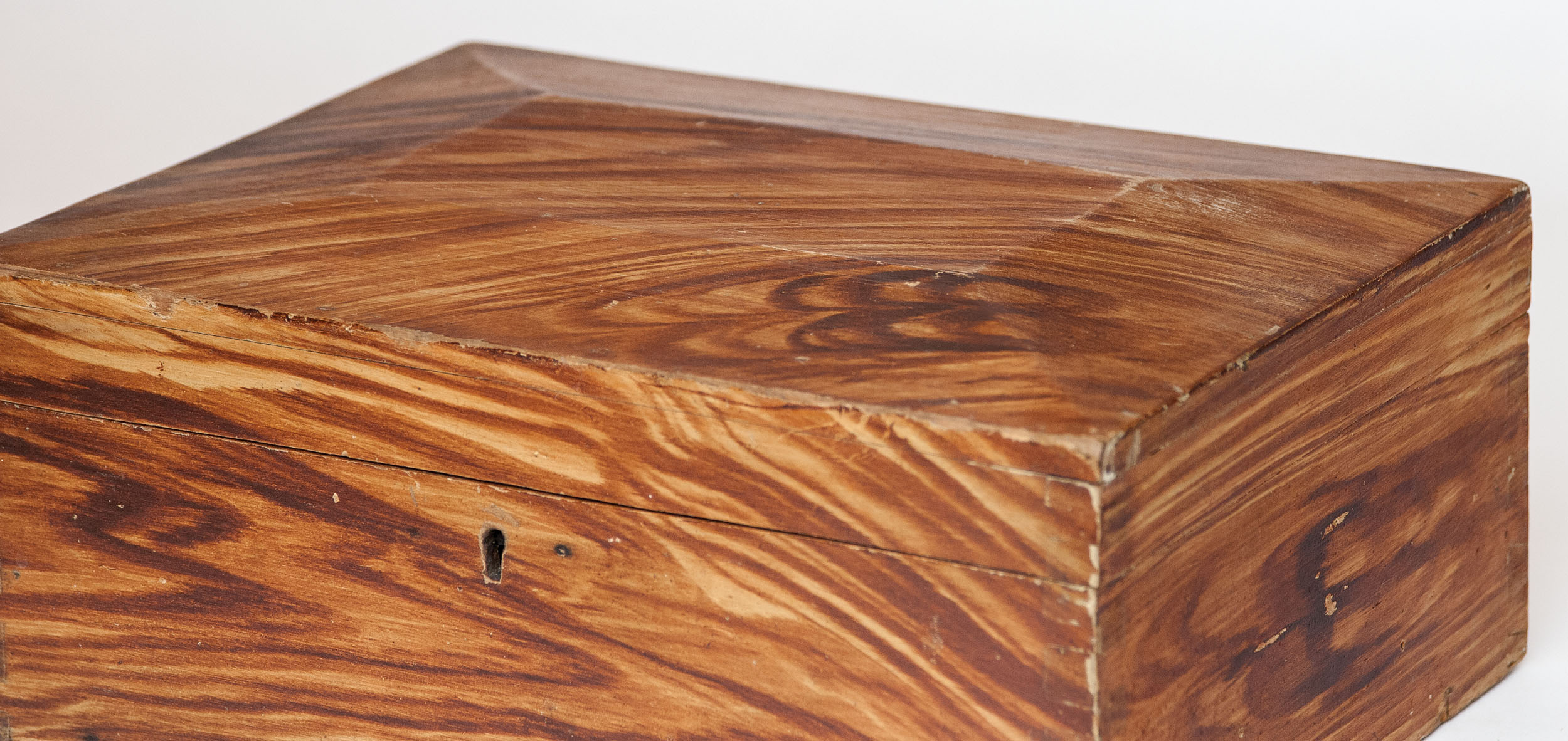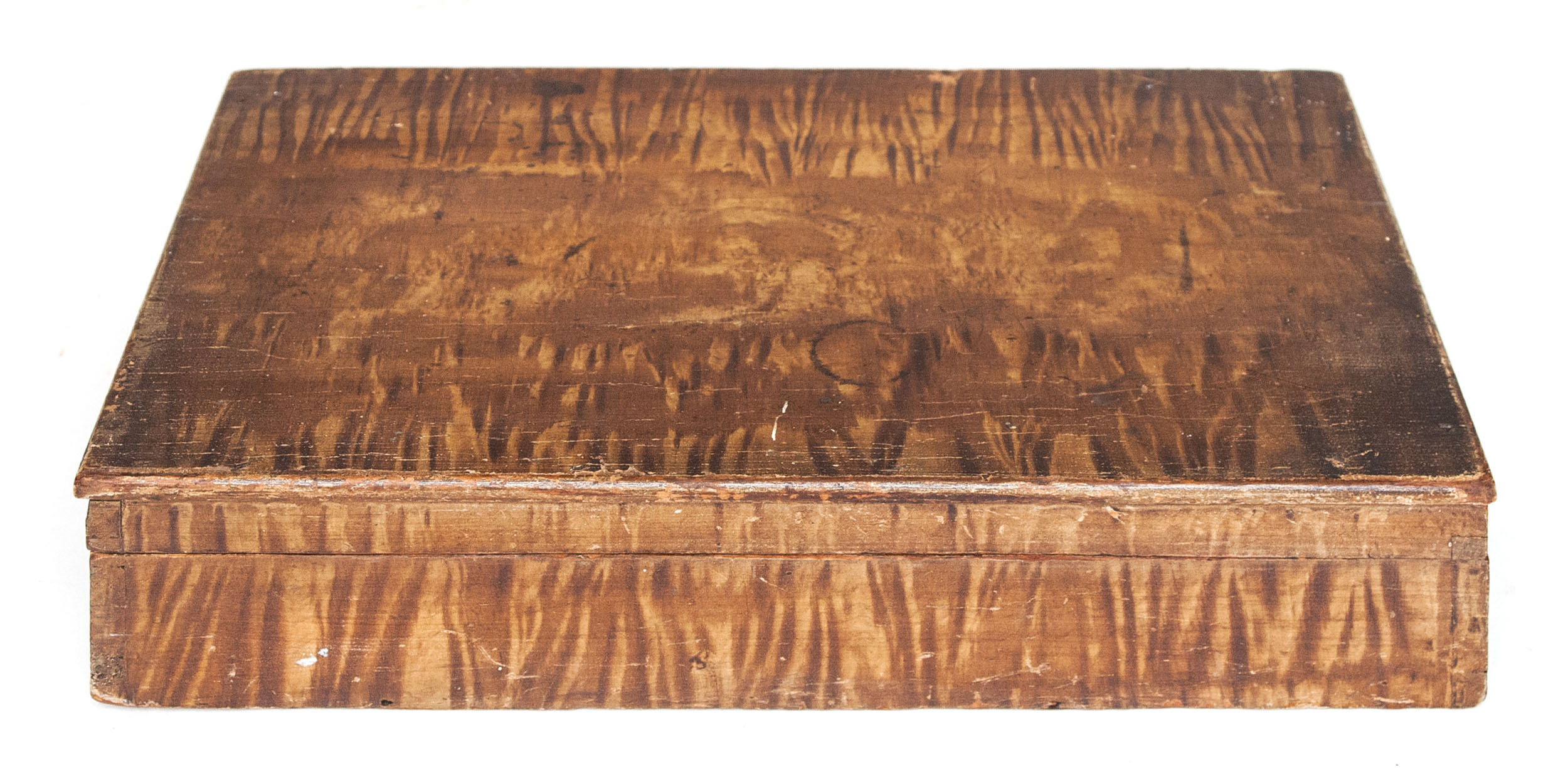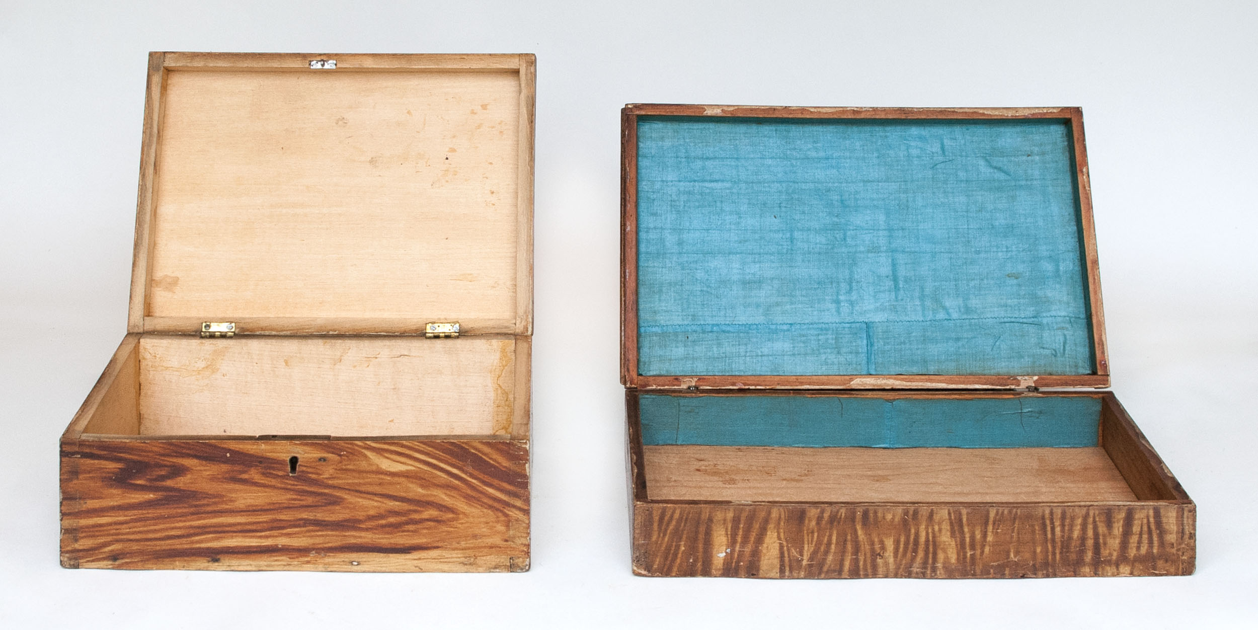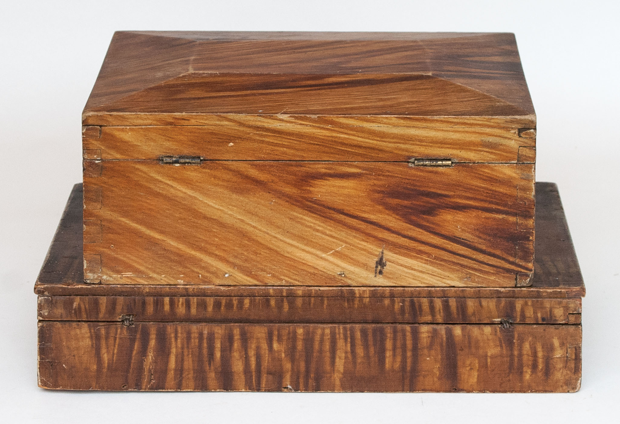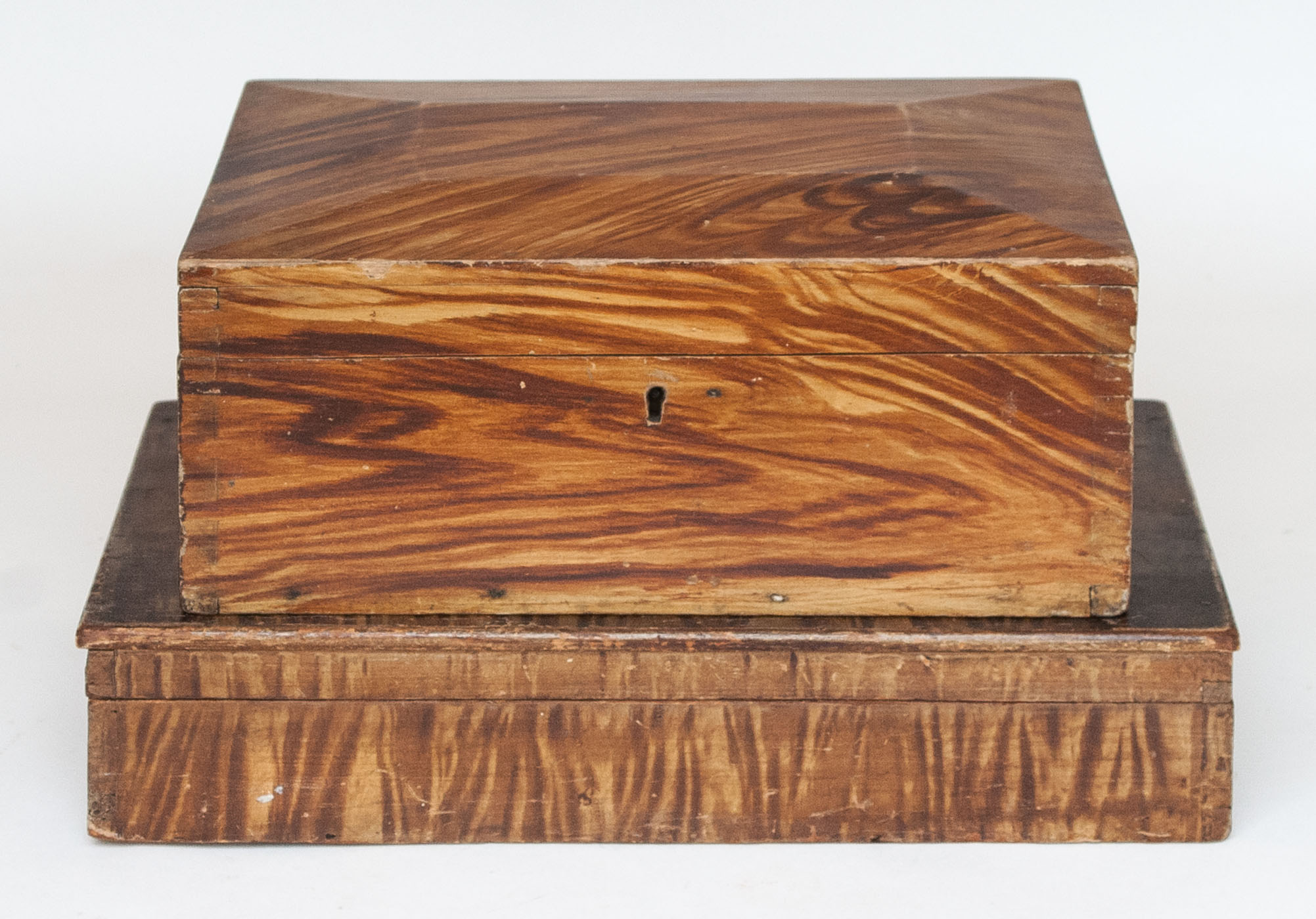 Poplar/white wood, dark brown figuring on a cream ground, dovetailed case, slightly raised, rectangular-shaped sculpted lid, 4 1/4″ h, 11″ w, 8″ d; Poplar with tiger maple graining, flat lid with slight overhang, wire snipe hinges, 2 5/8″ h, 13 1/4″ w, 8″ d.