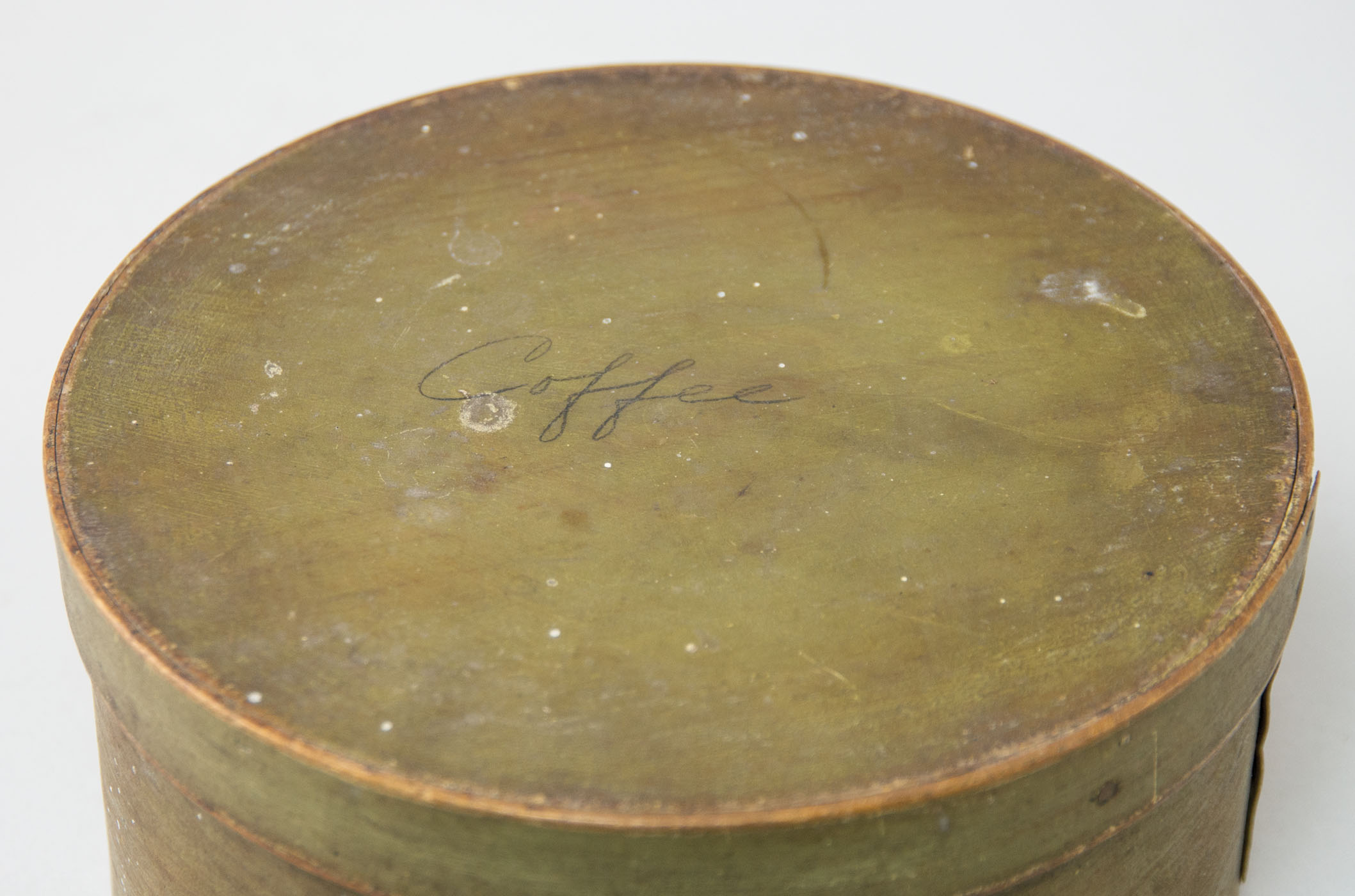 Set of three graduated round pantry boxes, in original light green painted finish, 3 3/4″, 3″ and 2 1/2″ h and 5 1/2″, 6 1/2″ and 7 1/2″ dia.