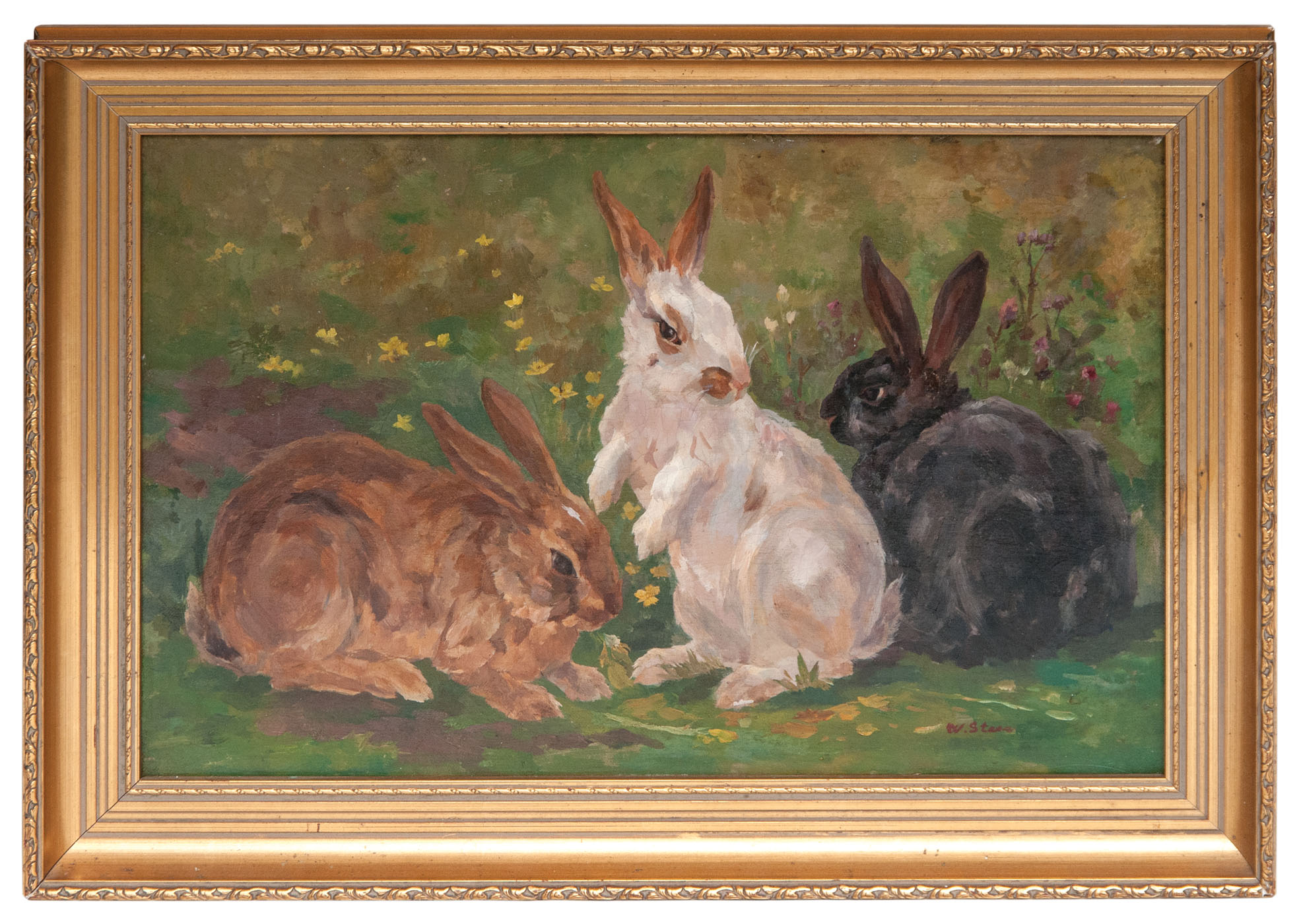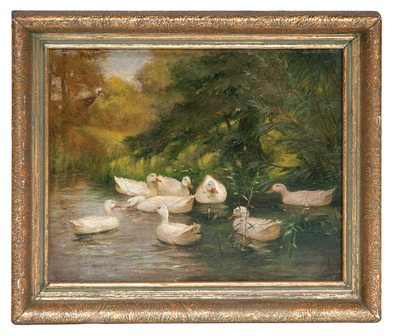 Oil on canvas, three rabbits in a field of flowers in a gilt frame, signed “W. Stern” l.r., 12″ x 18″; oil on oak panel, white ducks in a pond, signed “Verstraeten” l.r., 7 1/2″ x 9″.