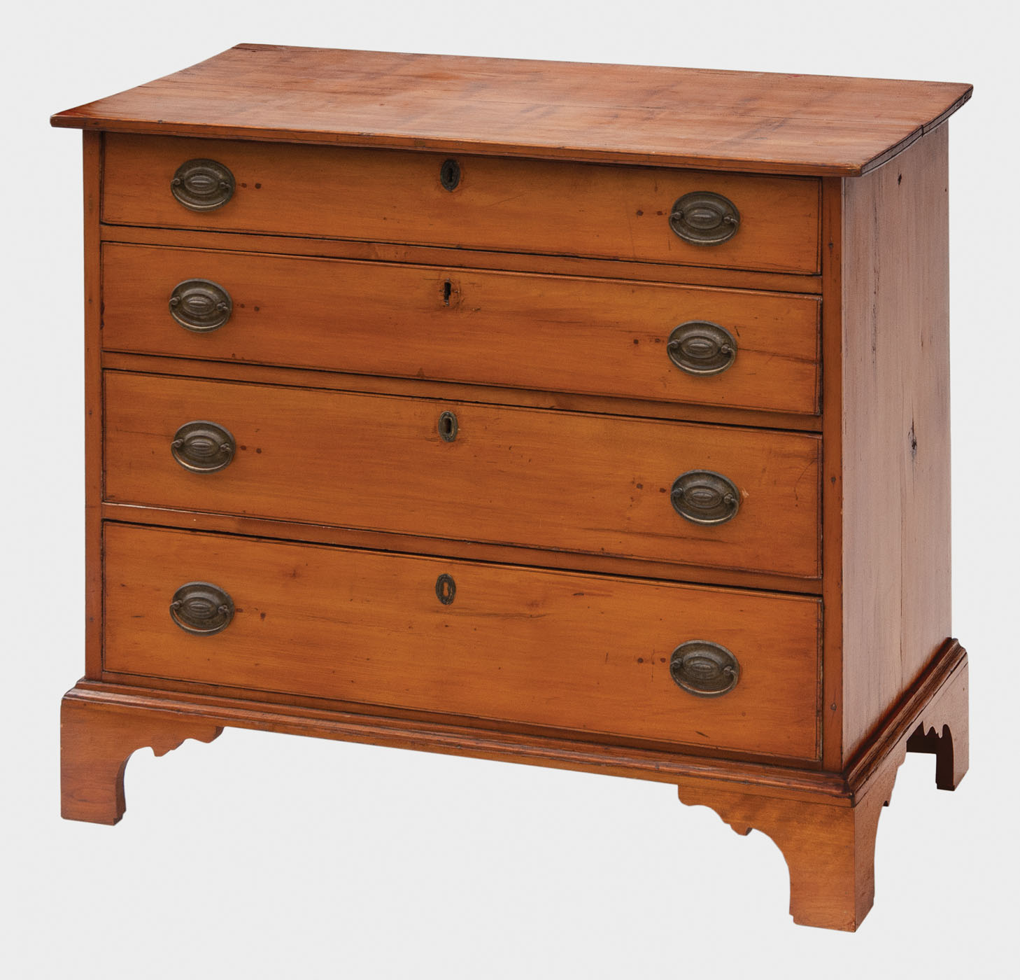 Maple, old refinish, four graduated drawers, oval brasses replaced, thumbnail molded lid, dovetailed and thumbnail molded drawers, 34″ h, 38 1/2″ w, 19″ d, (ex. Robert Wheaton estate, Cumberland Foreside, ME).