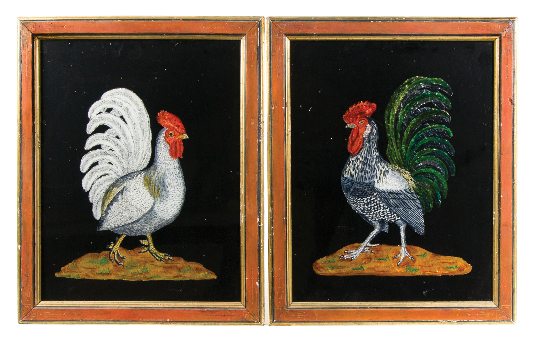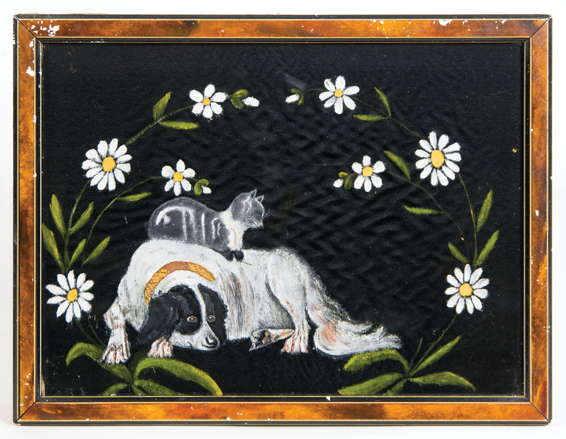 Two framed reverse glass pictures of roosters with tinsel tails, 16 1/2″ x 12 1/2″ (sight); Painting on black cloth of a dog with gray cat on his back, surrounded by yellow and white daisies, 9″ x 12 1/2″ (sight); (ex. Marjorie Ellis estate, Sandwich, MA).