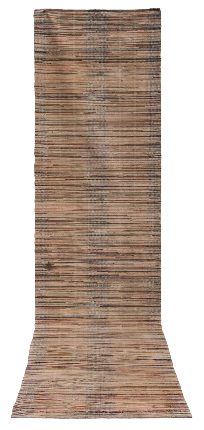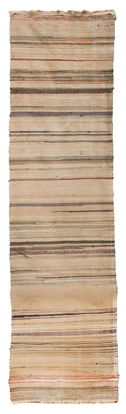 Two striped and a watermelon style, cotton, all have minor stains and fading, 41″ loom w x 14′, 36″ loom w x 14′, 43″ loom w x 12′ (watermelon).