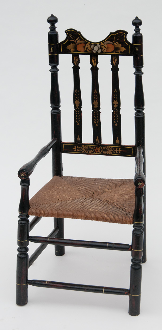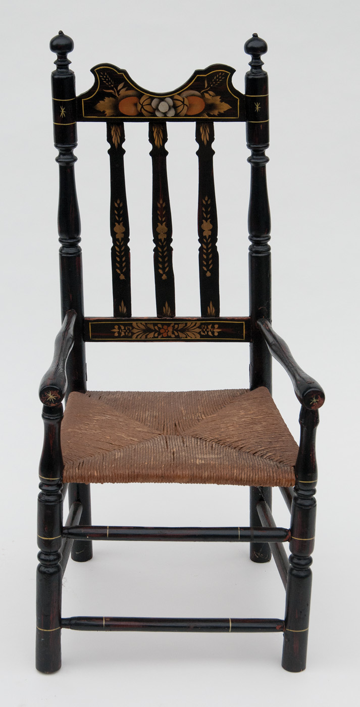 Carved crest, turned ball finials, repainted with fruit on crest, rush seat, 15″ seat h, (ex. Robert Wheaton estate, Cumberland Foreside, ME).