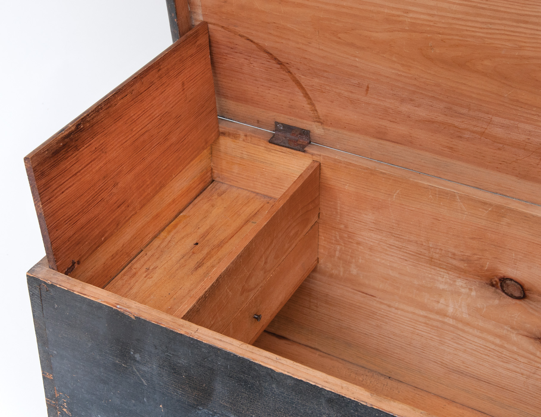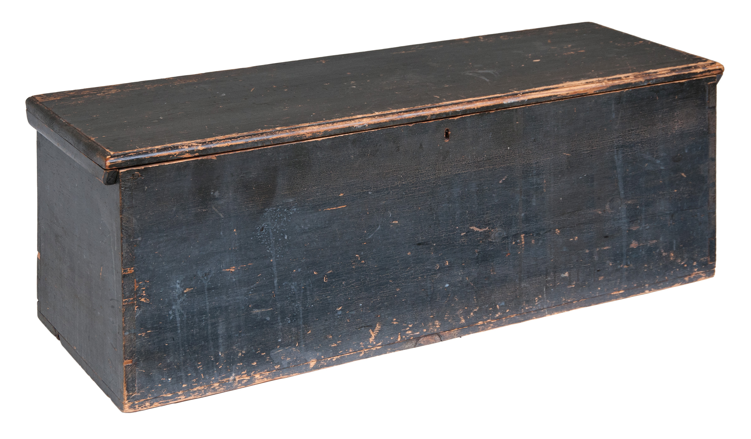 Pine, original gray/green painted finish, six-board dovetailed construction, lidded till with dovetailed drawer under, lock set intact, dovetailed case, molded top with side cleats, found in New Hampshire, 15 1/4″ h, 44″ l, 15″ d.