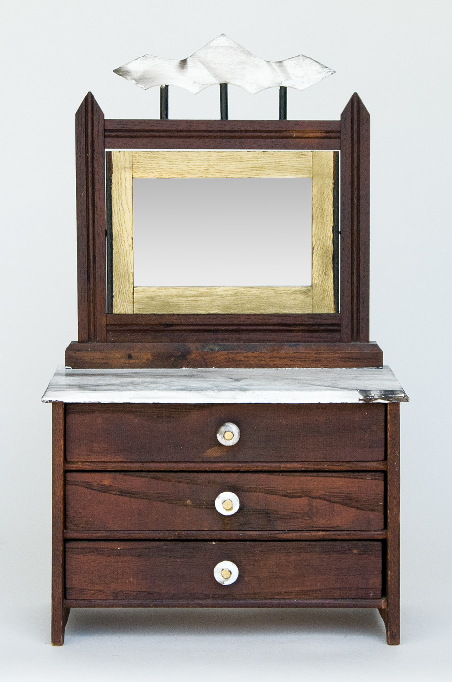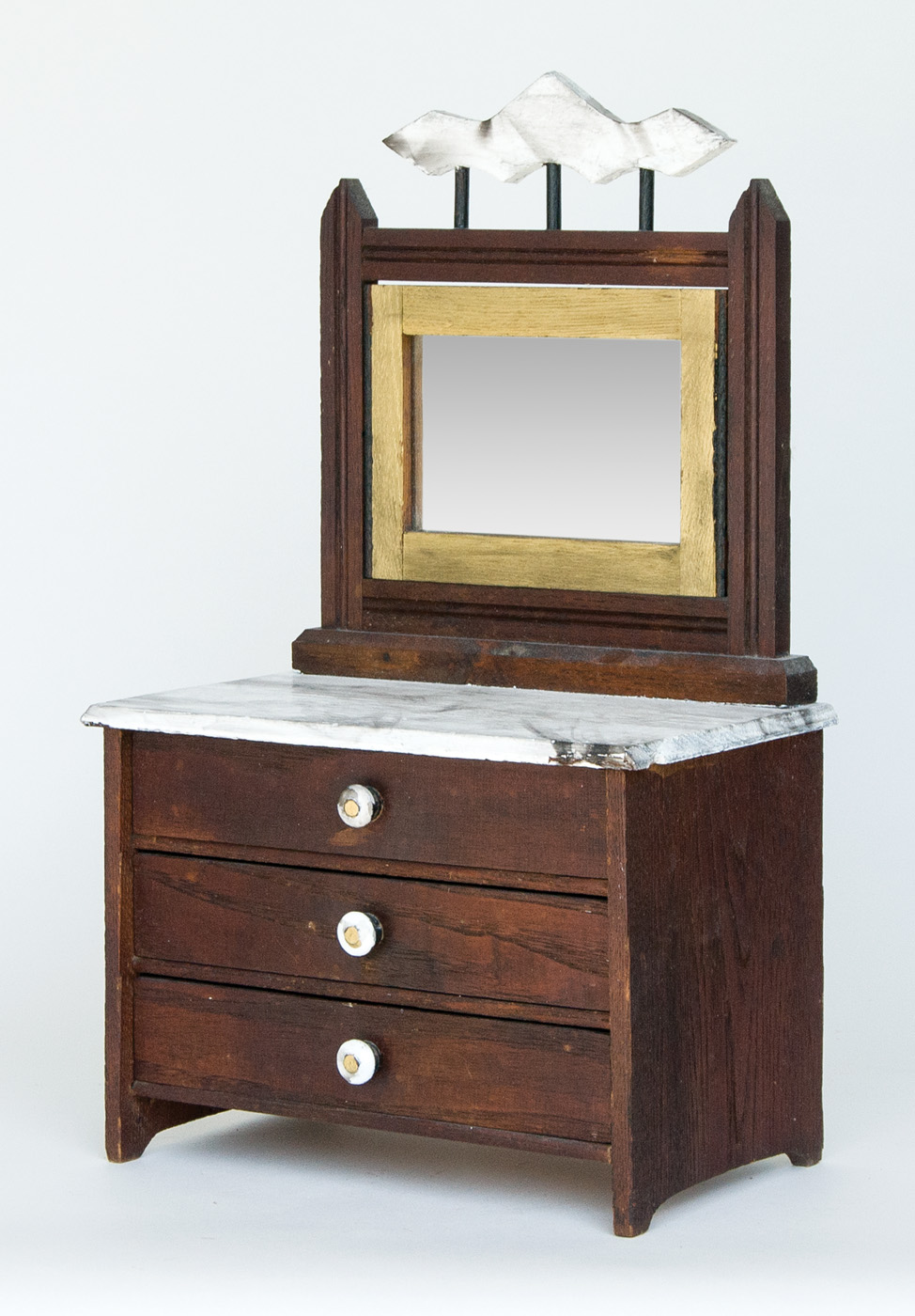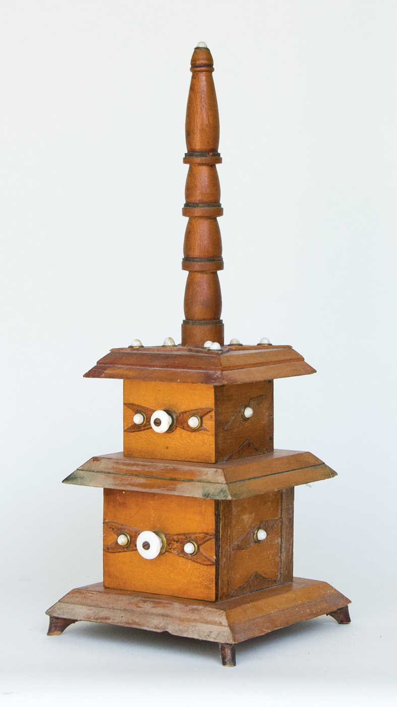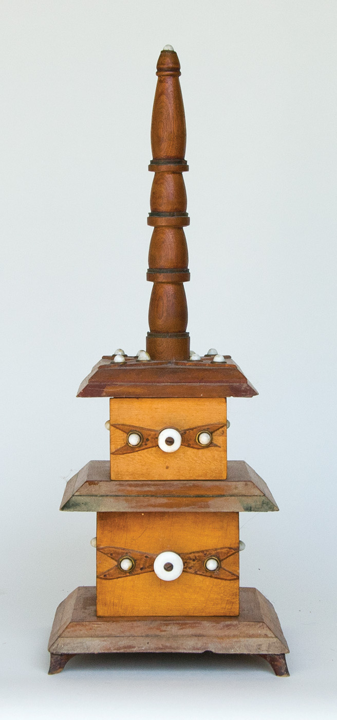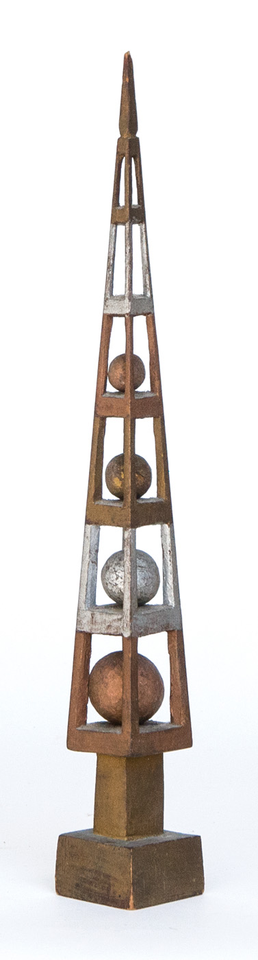 Gold and silver painted obelisk, with four carved graduated balls inside, 14″ h; Doll’s chest with applied mirror, dark stain and simulated marble top paint, 17 1/2″ h; Detailed double-stacked sewing box, with columnar top and white porcelain decoration, 23″ h; (ex. Marjorie Ellis estate, Sandwich, MA).