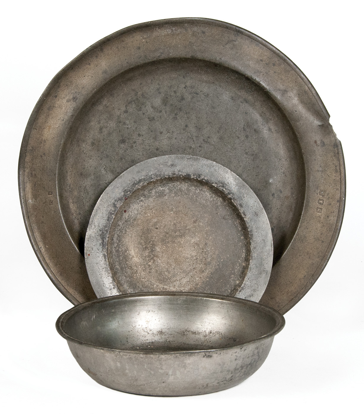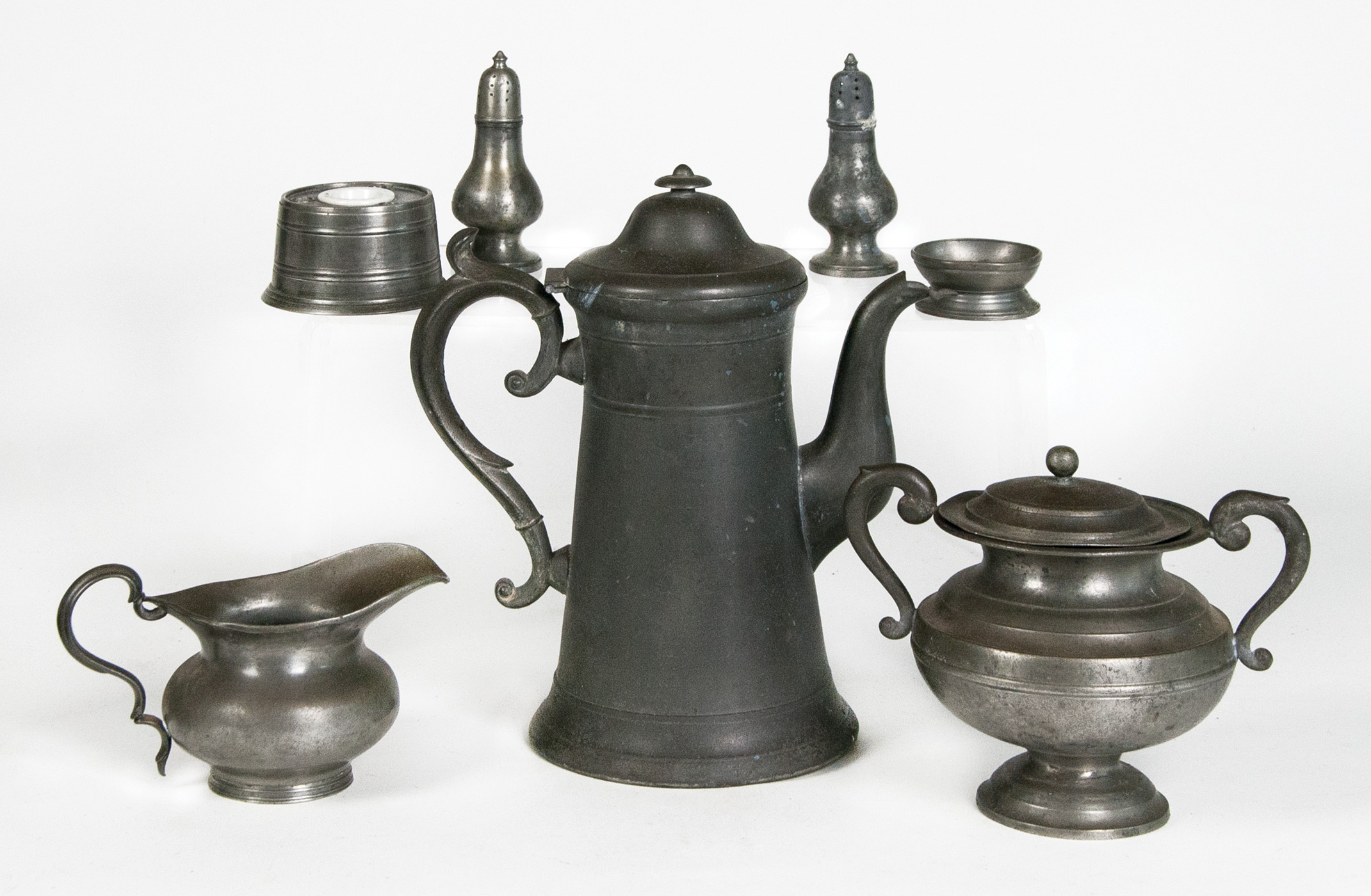 Ten pieces including a coffee pot marked “Dunham”, 11″ h; lidded sugar bowl with two handles, 5″ h; creamer marked “James Dixon & Sons, 1726″, 4″ h; inkwell with porcelain insert; salt and pepper; master salt; 10 1/2” basin; charger (as is); and pitted plate marked “Wheaton & Howett”, 9 1/4″ dia., (ex. Robert Wheaton estate, Cumberland Foreside, ME).