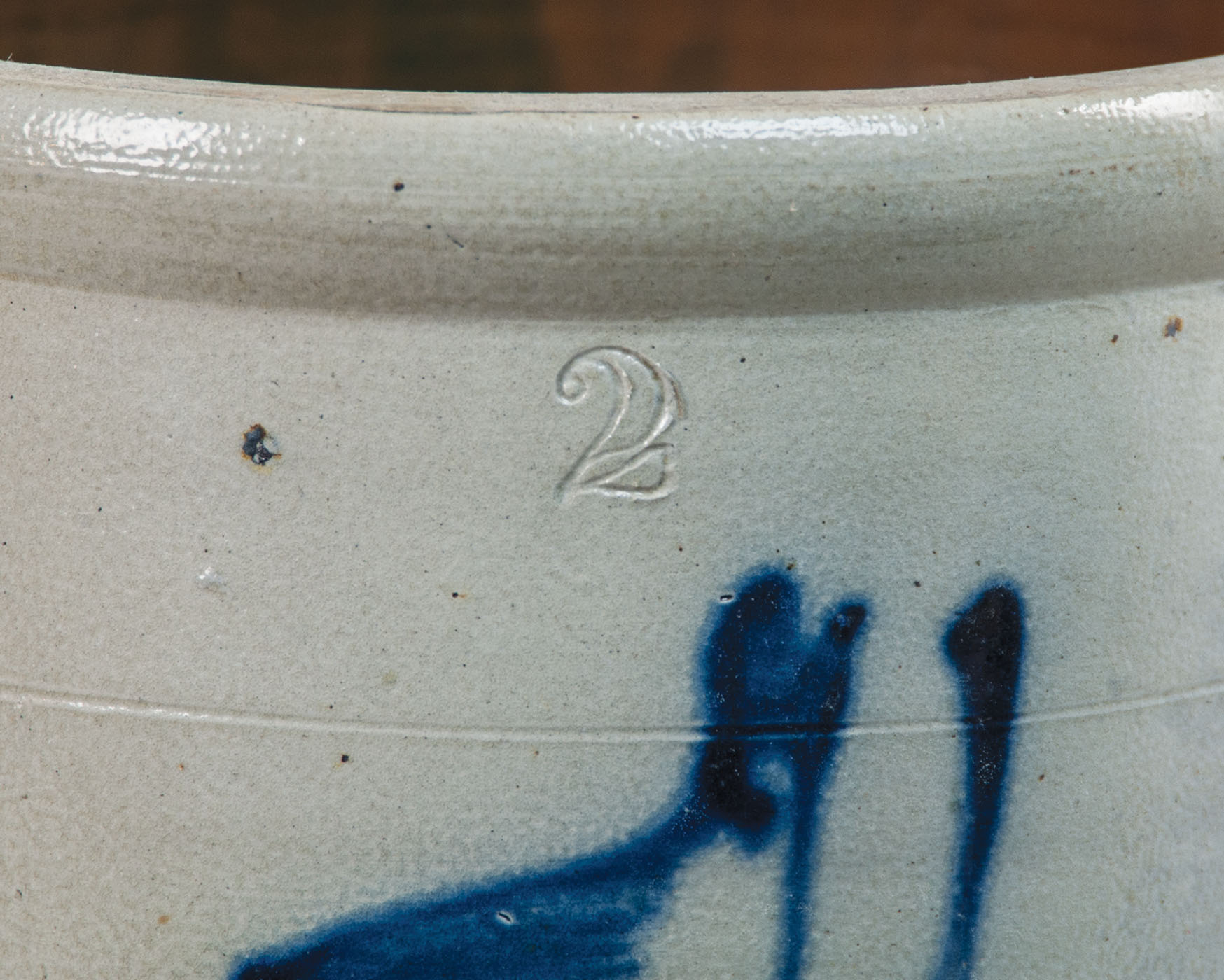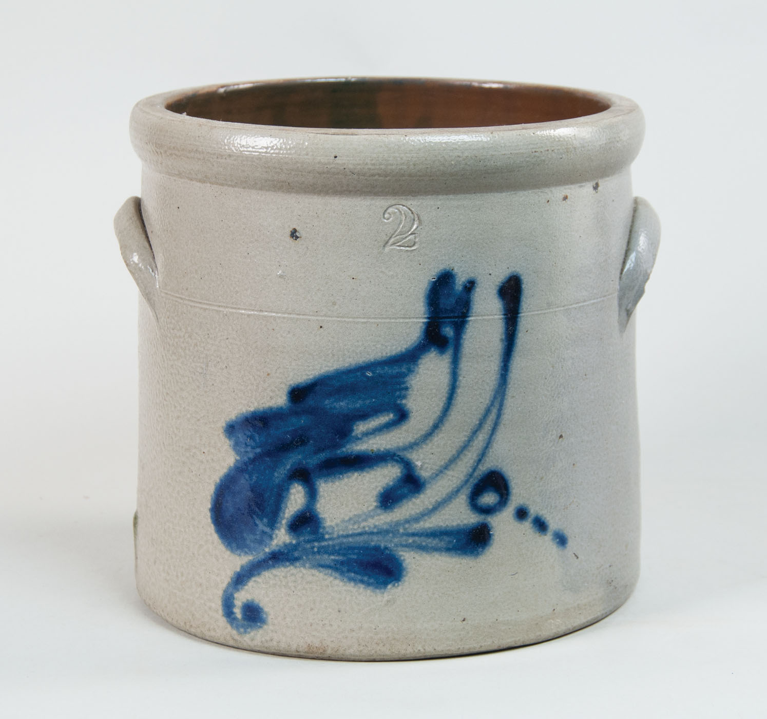 Two-gallon crock, dark cobalt bluebird on a branch with curlicues, very good condition, 9 1/4″ h, 9 1/2″ dia, (ex. Fertig collection).