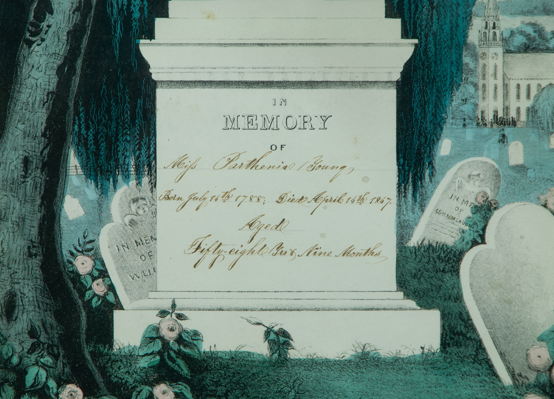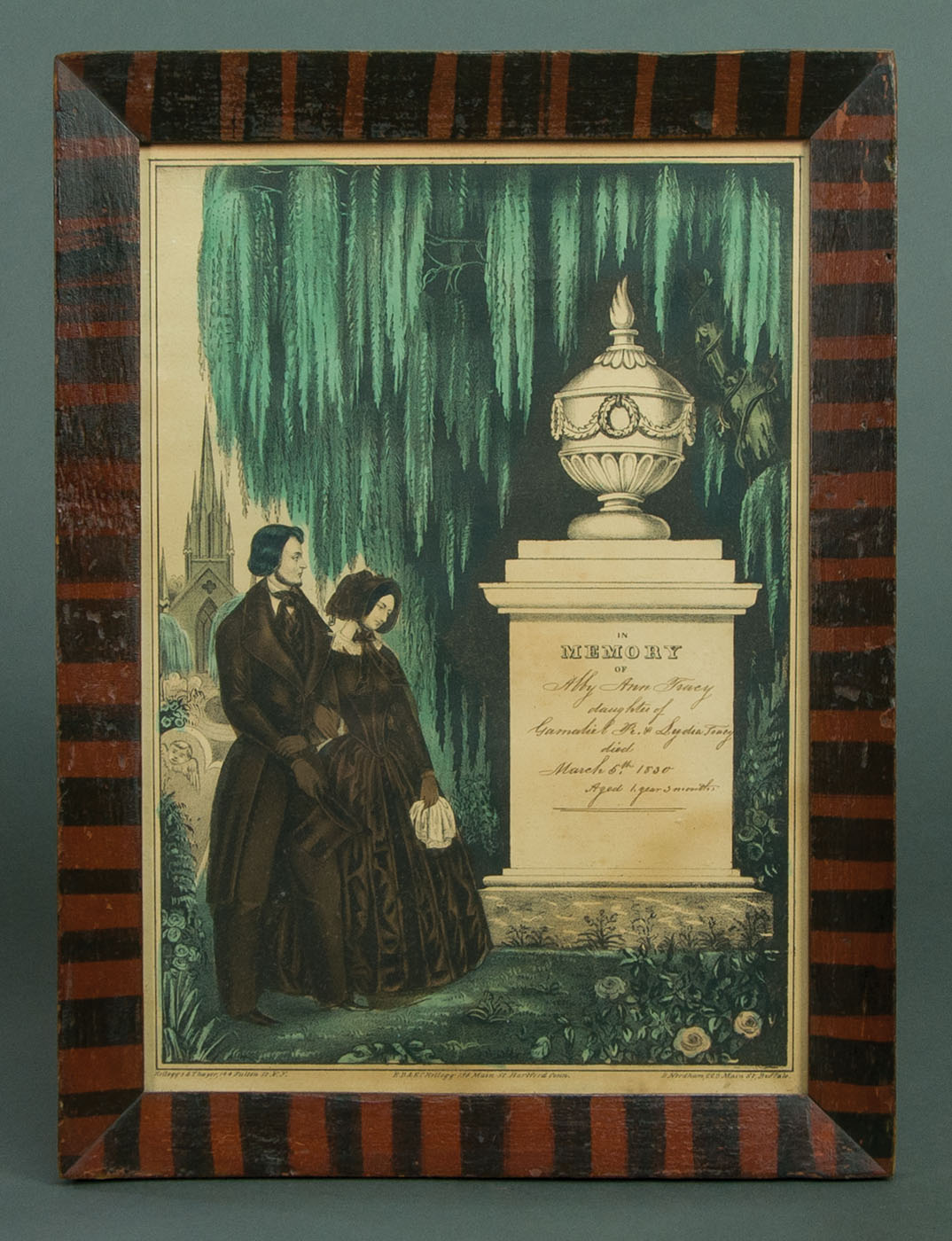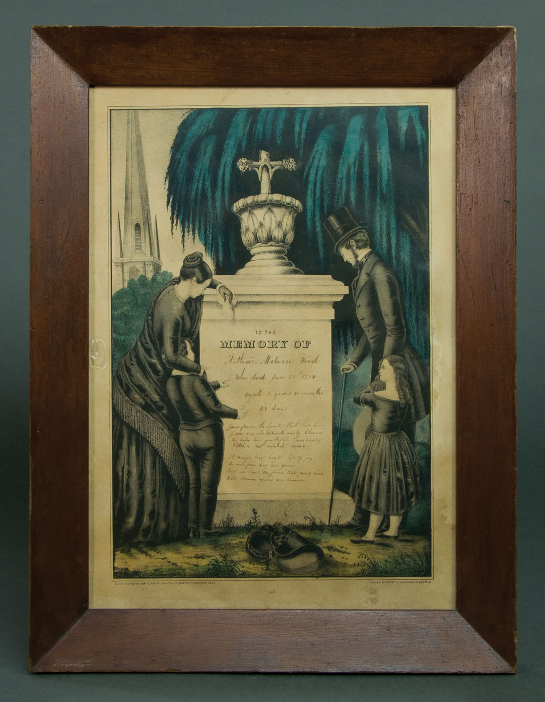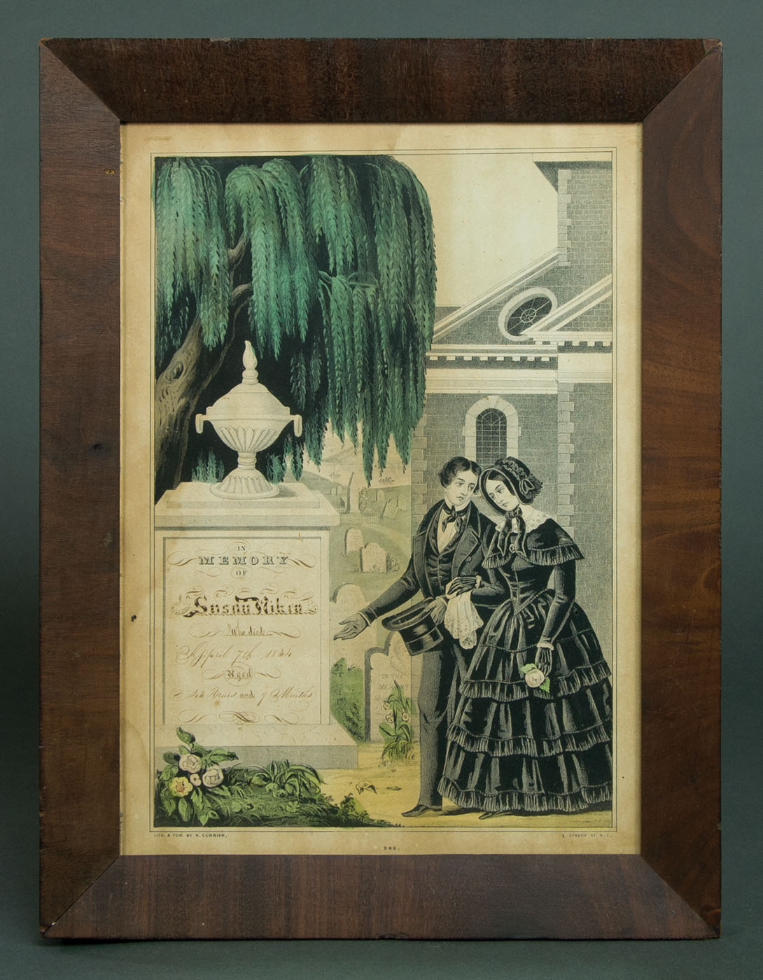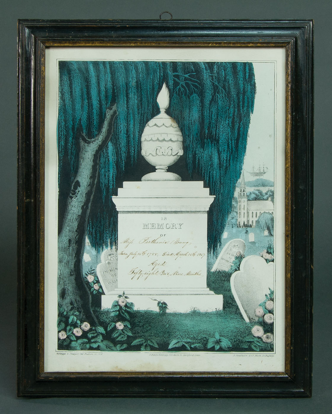 Four memorials, two with a young couple in mourning attire, one with a young couple and young children in mourning attire, and one with no figures; the two young couples stand to the side of the markers of their passed children with weeping willows and churches in the background, both moderately toned, one printed by N. Currier, 13 3/4″ x 9 1/2″ (sight), the other printed by Kellogg & Thayer, in a nice red and black grain painted frame, 13 1/2″ x 9 1/4″ (sight); the young family mourns over their five year old’s grave, with weeping willows and a church in the background, moderately toned and nice old glass, printed by Kellogg & Comstock, 13 3/4″ x 9 1/2″ (sight); unattended marker denoting “Miss Parthenial Young” of fifty-eight years died 1847, flowers and a willow tree in the foreground, as a church lets out in the background, a three-masted ship is anchored offshore in the distance, minor toning to bottom edge, printed by Kellogg & Thayer, 14″ x 10 1/4″ (sight); (ex. Fertig collection).