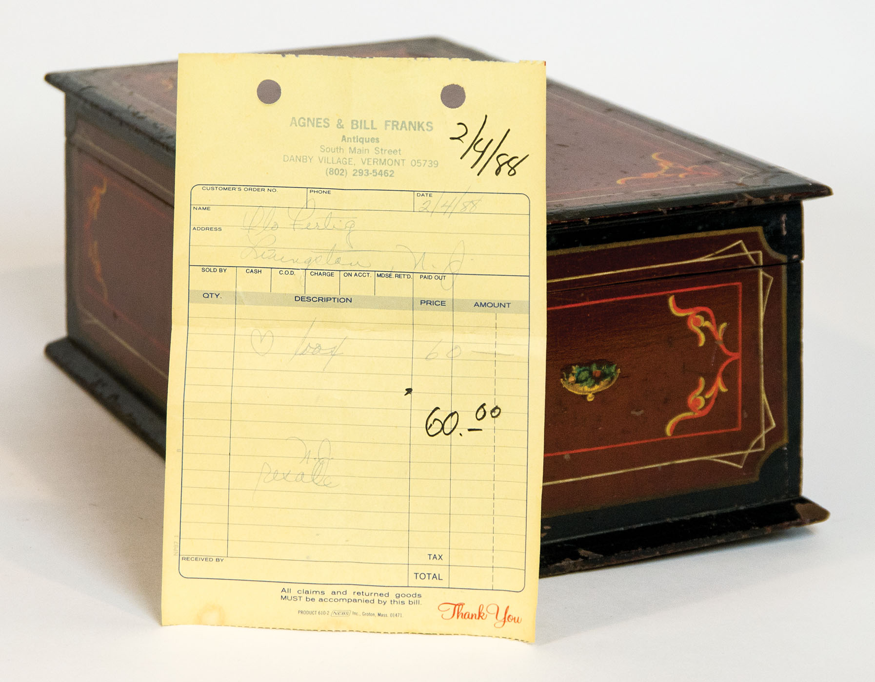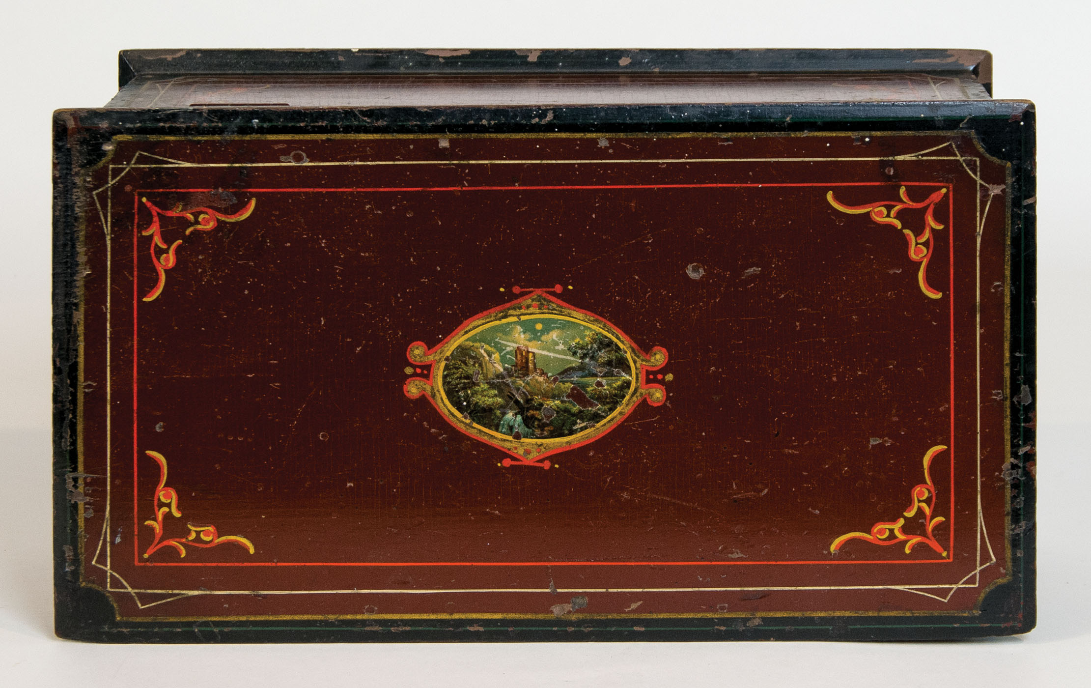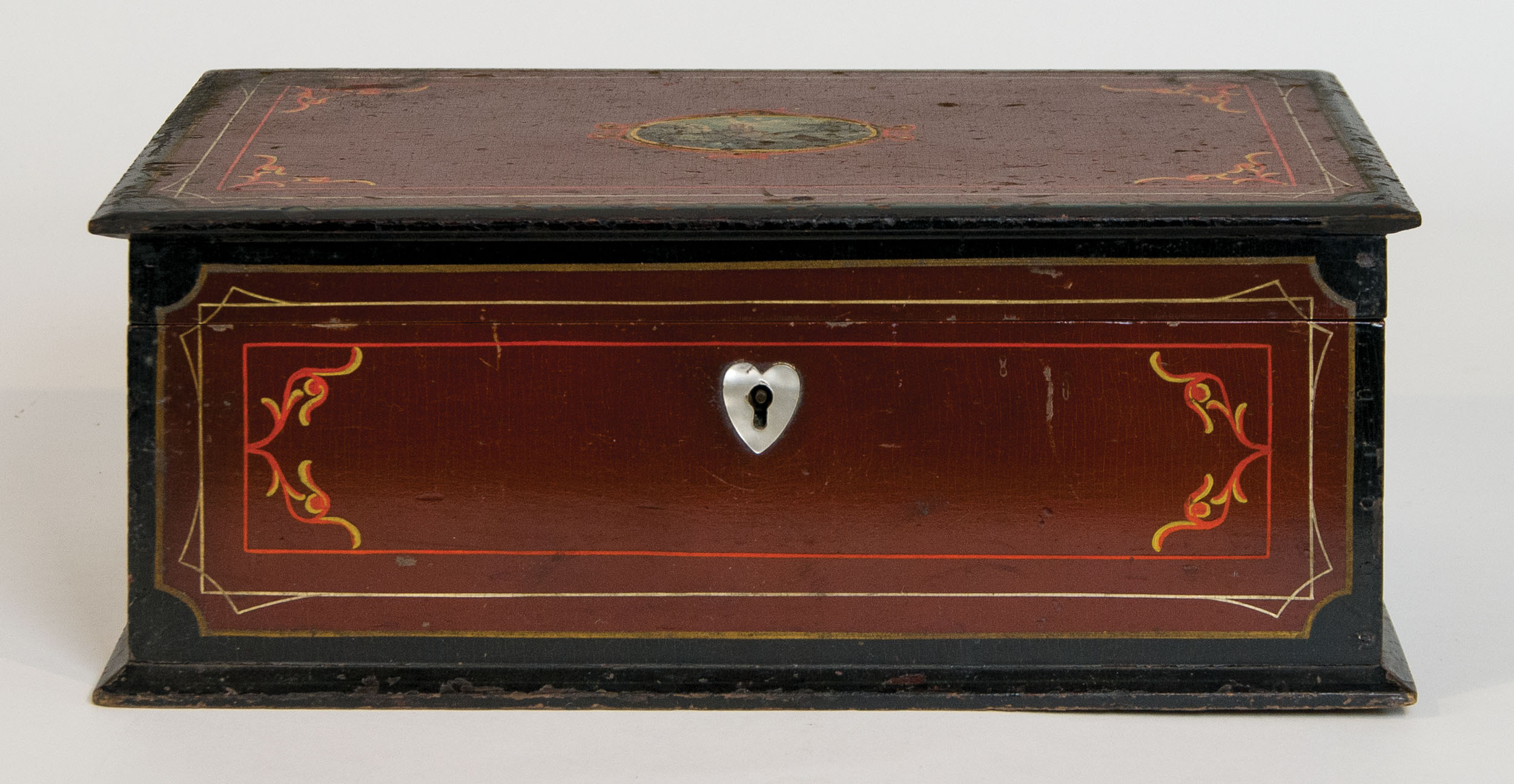 Original painted finish, dark cherry red, with finely detailed coach painted designs on all sides in red, yellow and white, central oval medallion centered on lid showing a river scape, mother-of-pearl heart escutcheon, some minor paint loss and scratches, (note: Howard purchased Feb. 4, 1988 in VT for $60), 6″ h, 15 1/2″ l, 8 1/2″ d, (ex. Fertig collection).
