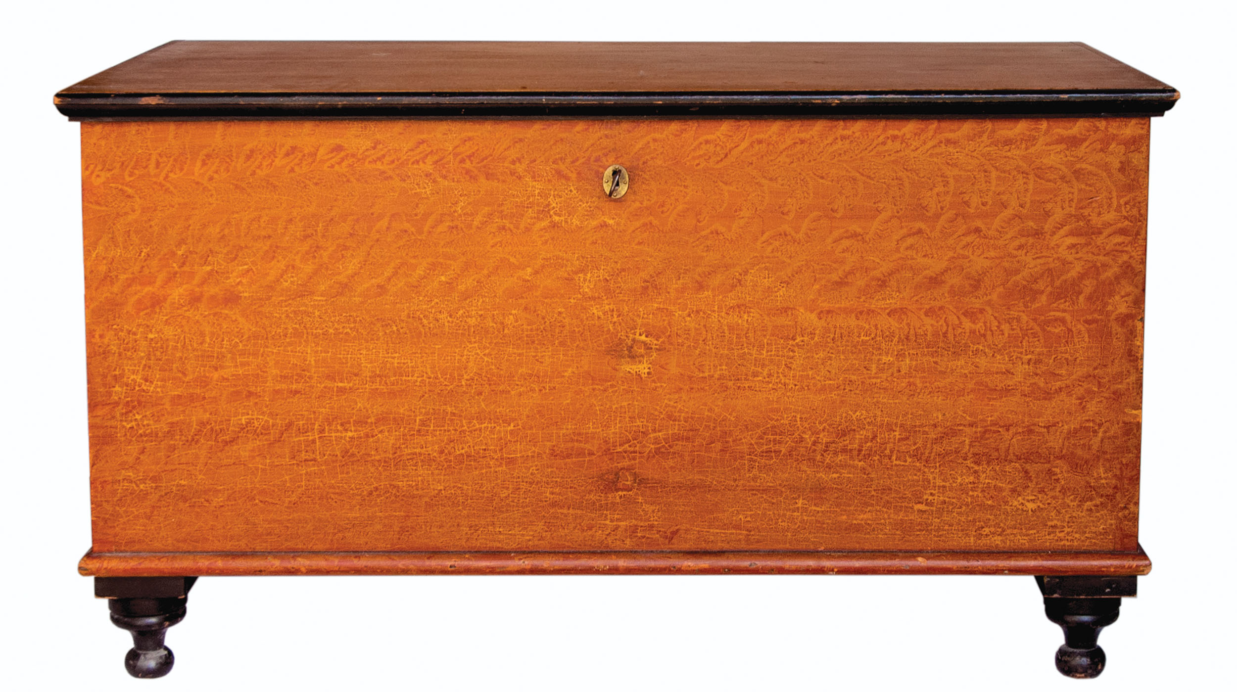 Feather and sponge painted, pine with walnut interior till, dovetailed case, applied and molded top and base trim, ebony painted accents, bun feet, lock and key with oval brass escutcheon, molded and breadboard ends on lid, (purchased by Fertig’s June 1987), 25″ h, 42″ w, 21″ d, (ex. Fertig collection).