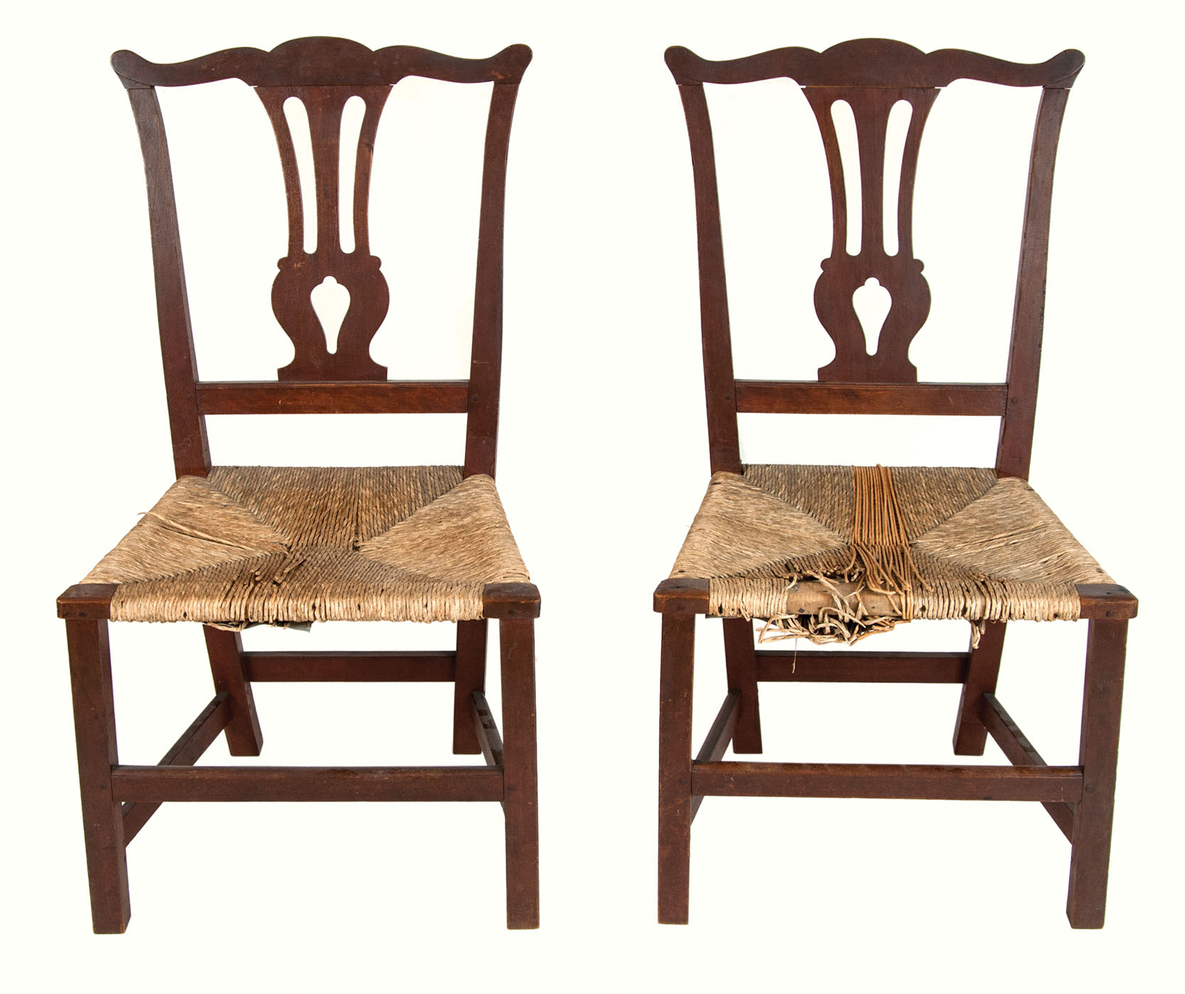 Pair of country side chairs, c. 1770, original red/brown finish, old rush seats, box stretchers, straight legs, 16″ seat h, 36 1/2″ overall h, 19″ w (seat), (ex. William Moore estate, Milton, MA).