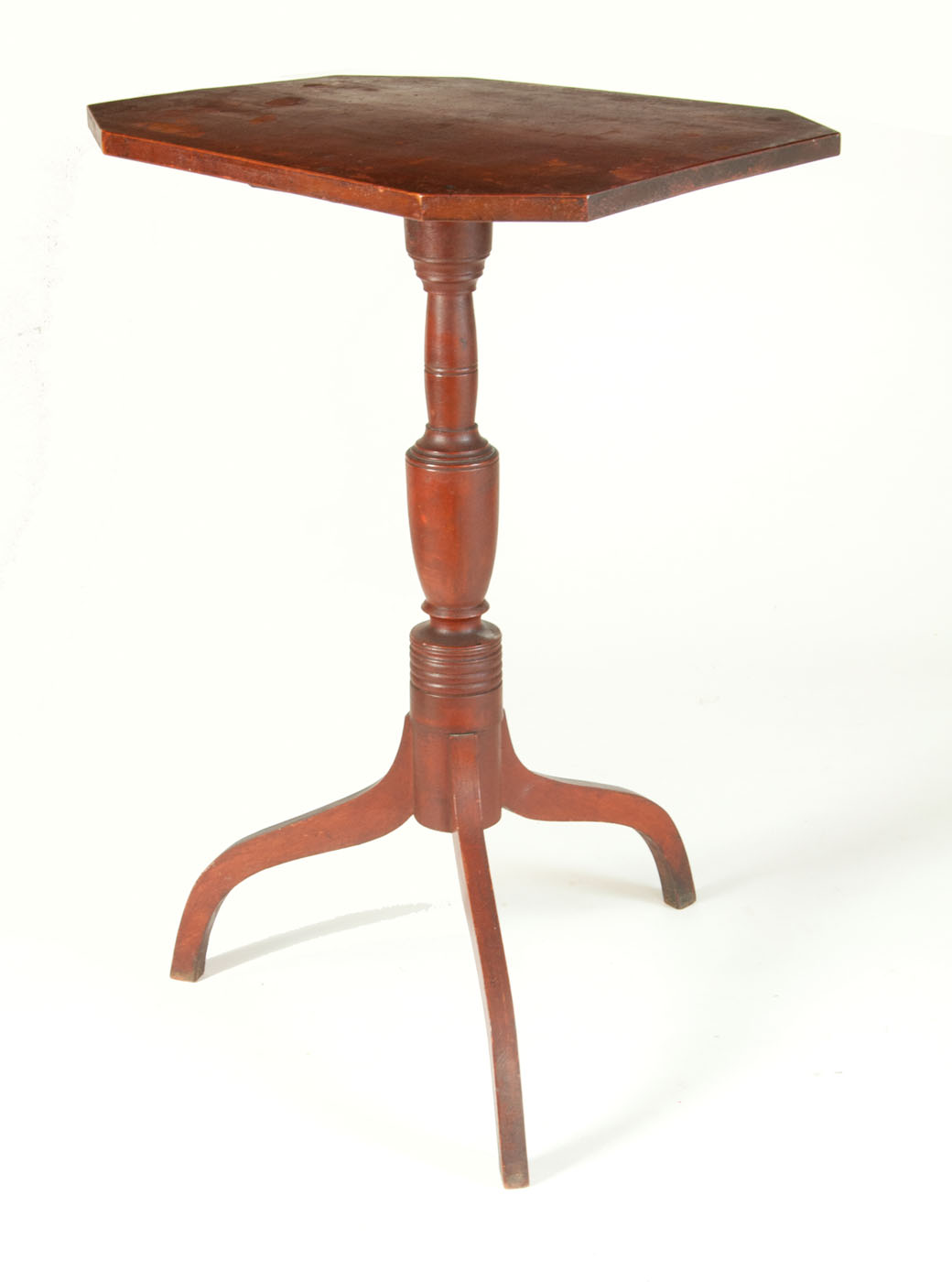Early American cherry candlestand, New Hampshire, in original red paint, 19th c. country design with urn shaft, rosehead nails holding clasp to top, deeply chamfered top, some wear to top, alligatored finish, all original and very good condition, 27 3/4″ h, 19 3/4″ w, 13 3/4″ d, (ex. William Moore estate, Milton, MA).