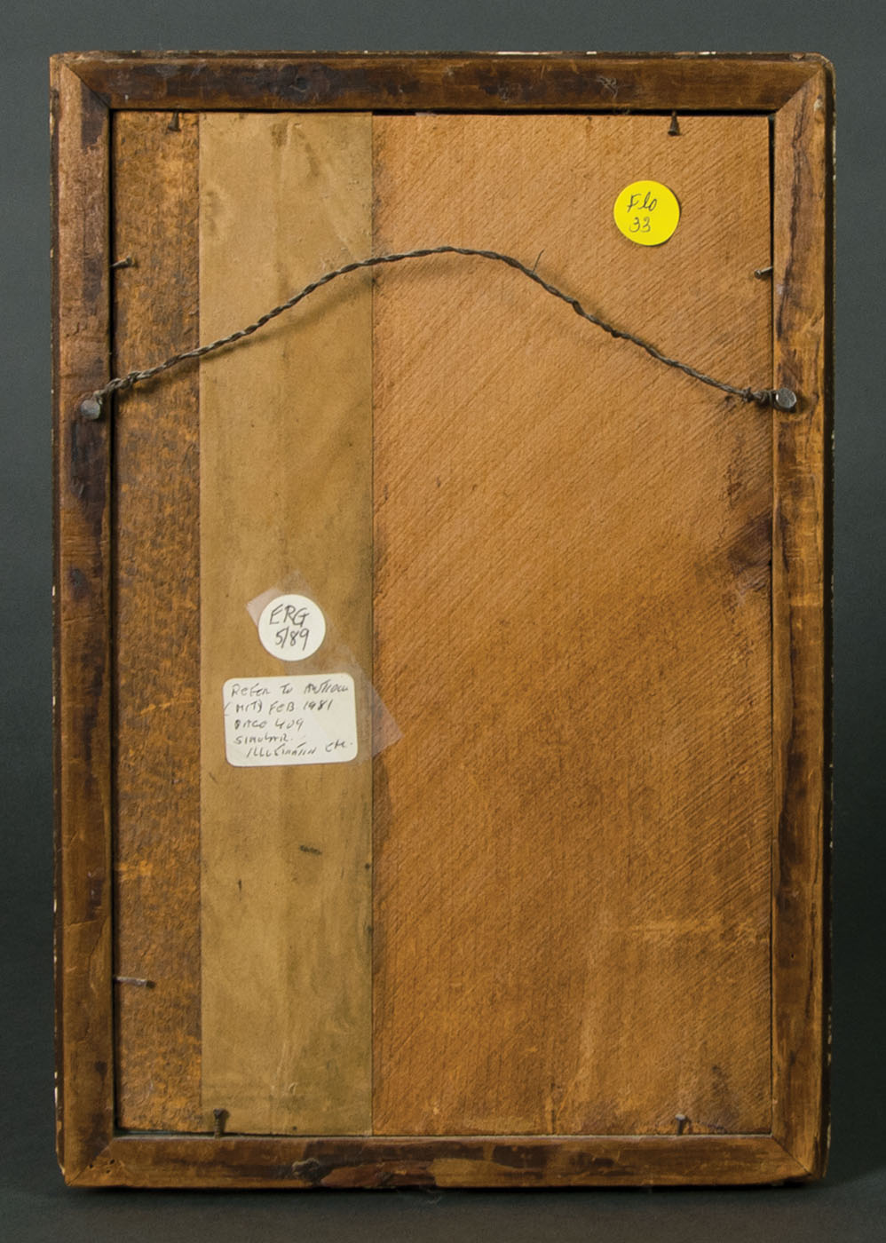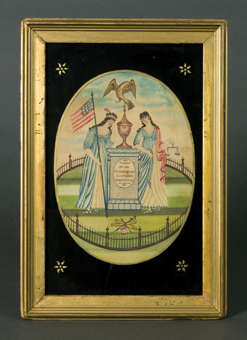 19th c. memorial watercolor “Sacred to the Memory of the Illustrious Washington”, in an oval eglomise glass, depicting a grieving Lady Liberty and Lady Justice, 11 1/2″ x 7 1/2″, (ex. Fertig collection).