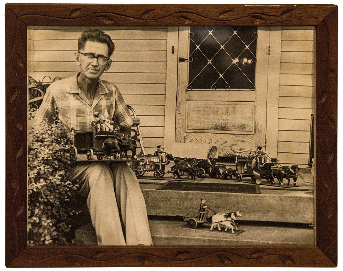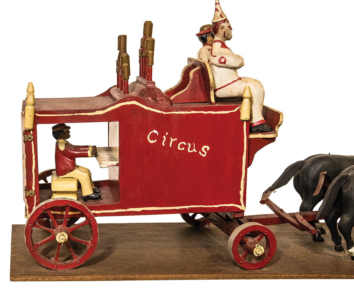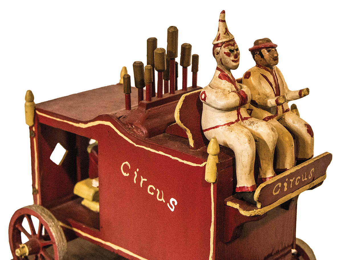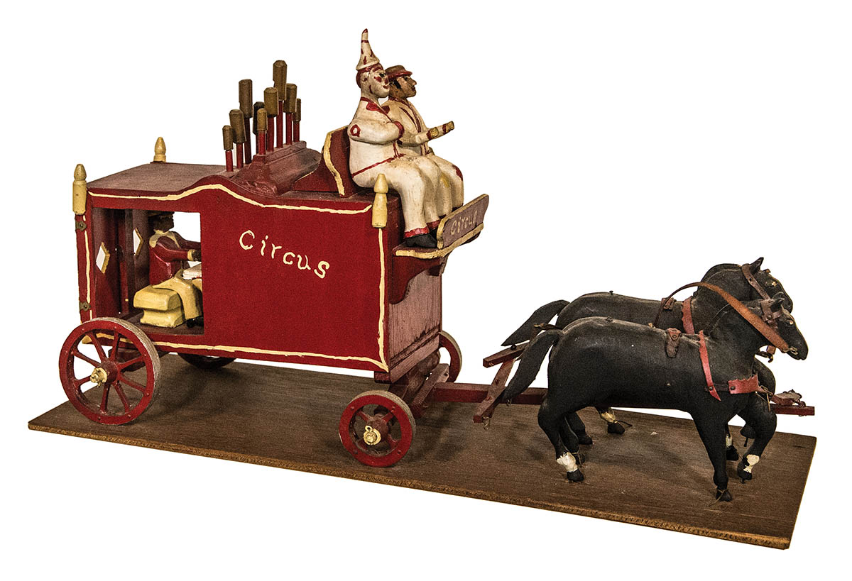 Folk art carved circus wagon, with driver and clown, and a calliope with black musician playing, two black horses pulling the wagon, 11″ h, 20″ l; and a framed photo of the carver with wagon and other circus horse drawn wagons.