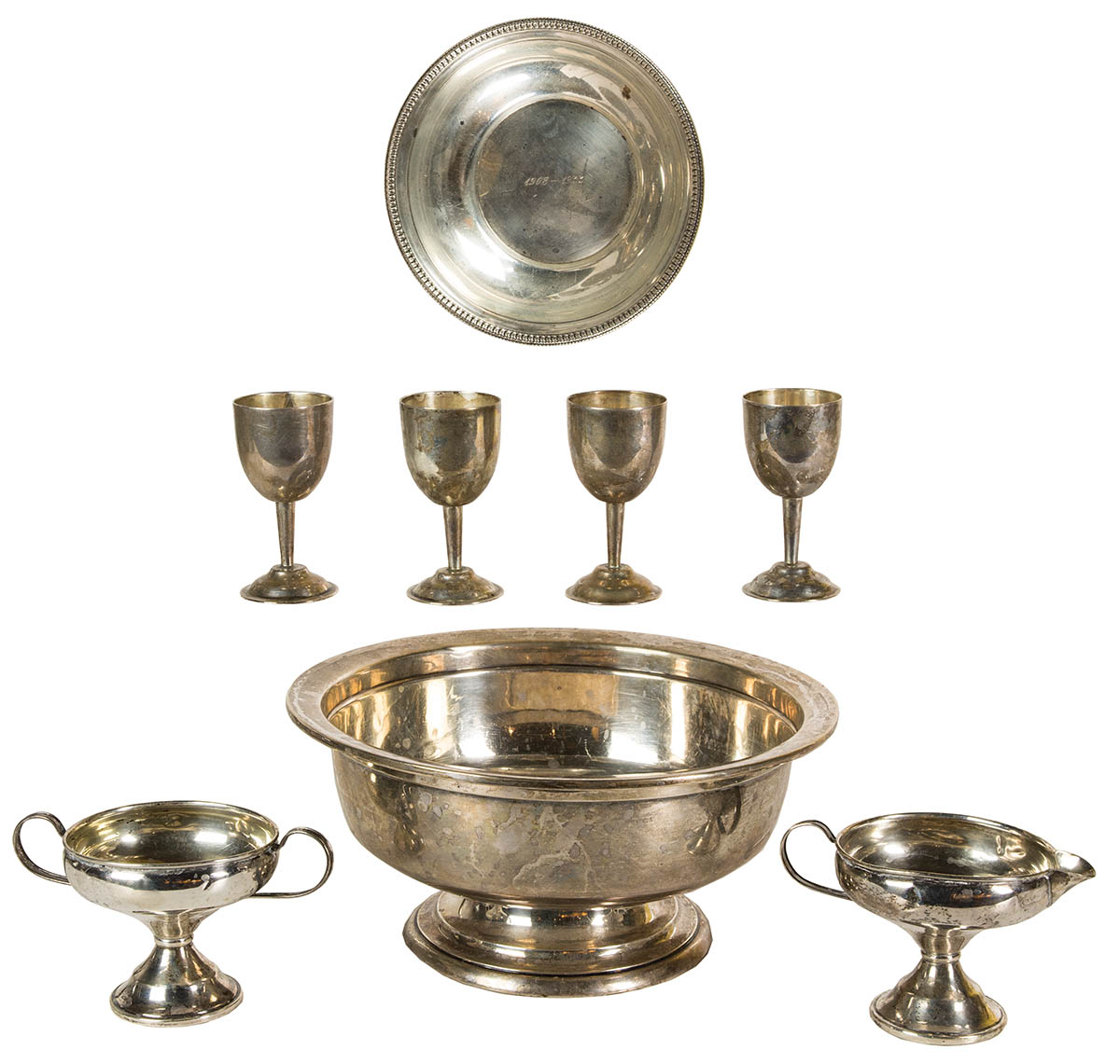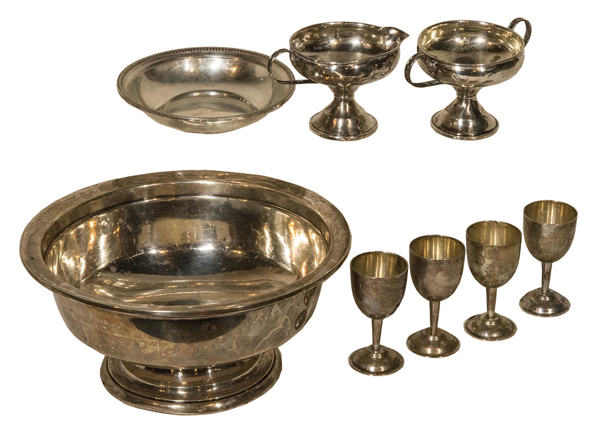 Bowl, reticulated edging, 5 1/2″ dia; Footed sugar and creamer (weighted foot), 3 1/4″ dia; Four footed demitasse goblets, Mexico “Topez”, 925, 3 1/4″ h; Footed serving bowl, 9 1/4″ dia, 24 ozt.