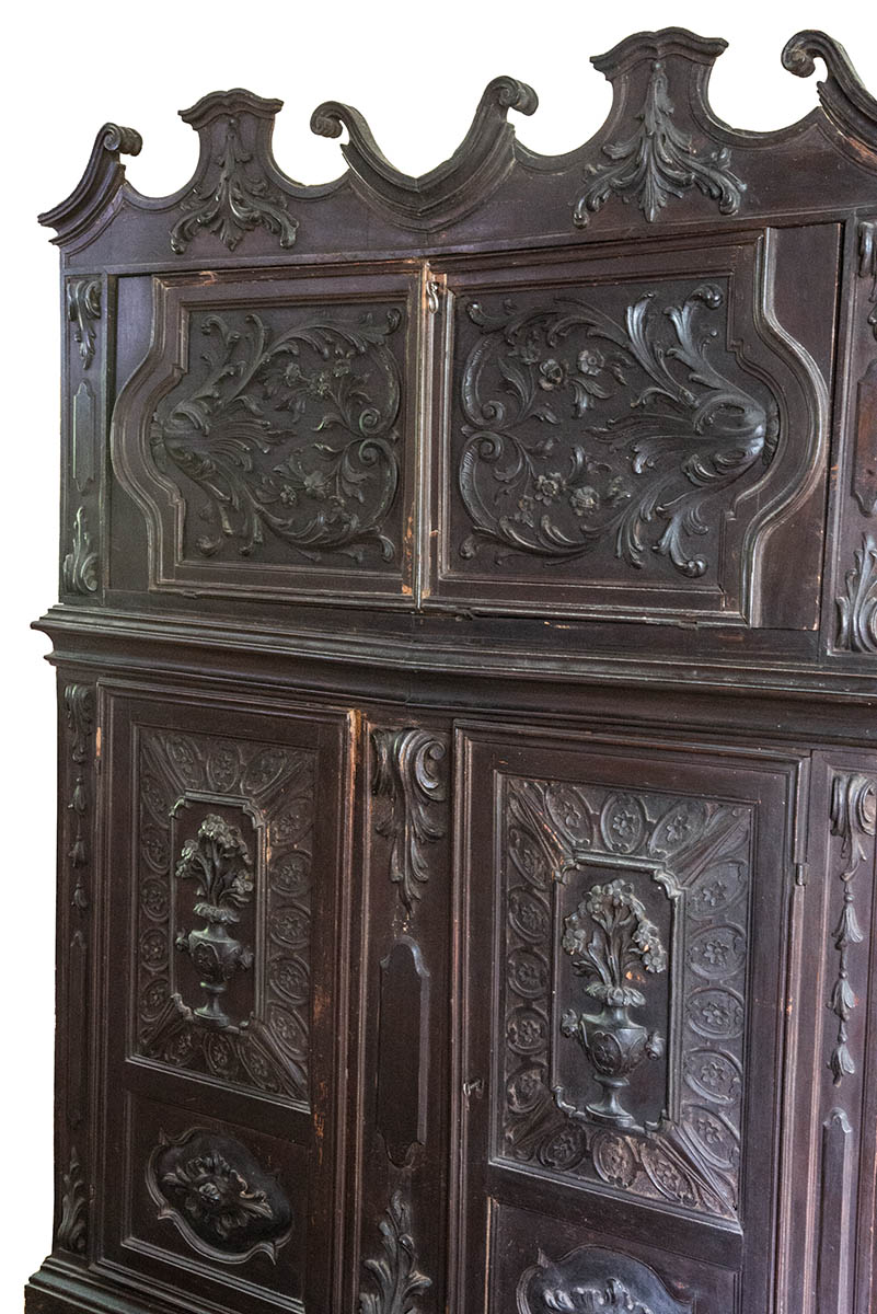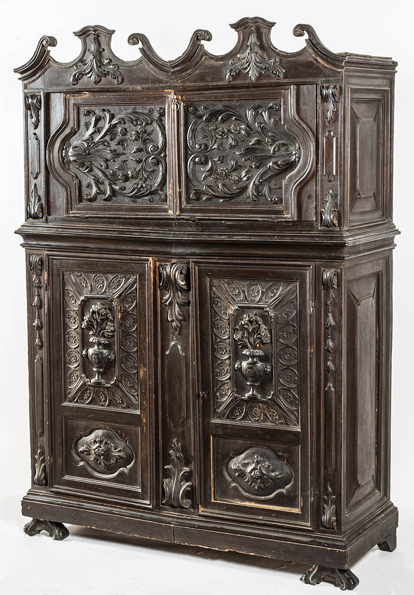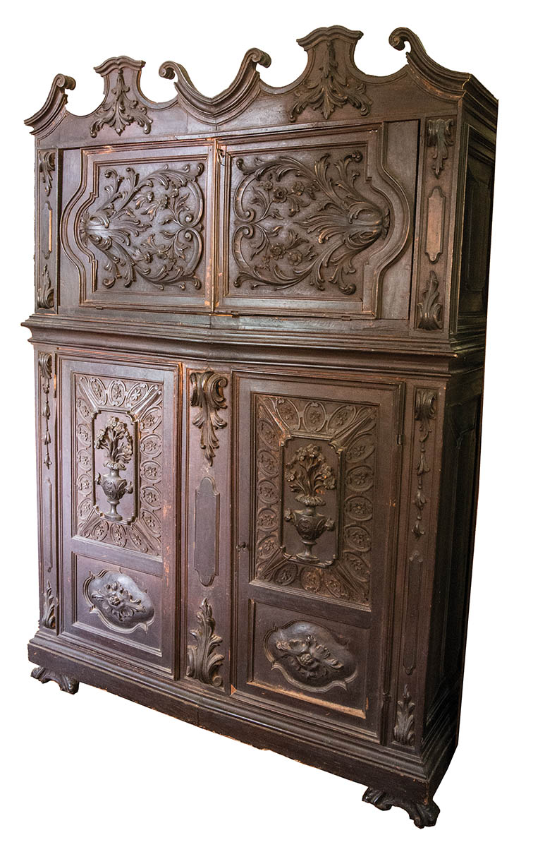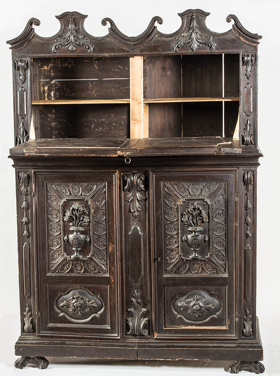 Heavily carved walnut, with fold down hinged lid, writing surface with ornate applied carvings, over a double door cupboard space, panel doors with carved raised pots of flowers, double raised flat panels on side, carved and scrolled front feet, arched back feet, appears to have some reconstruction and added interior shelving, 5′ 7″ h, 47″ w, 17 1/2″ d.