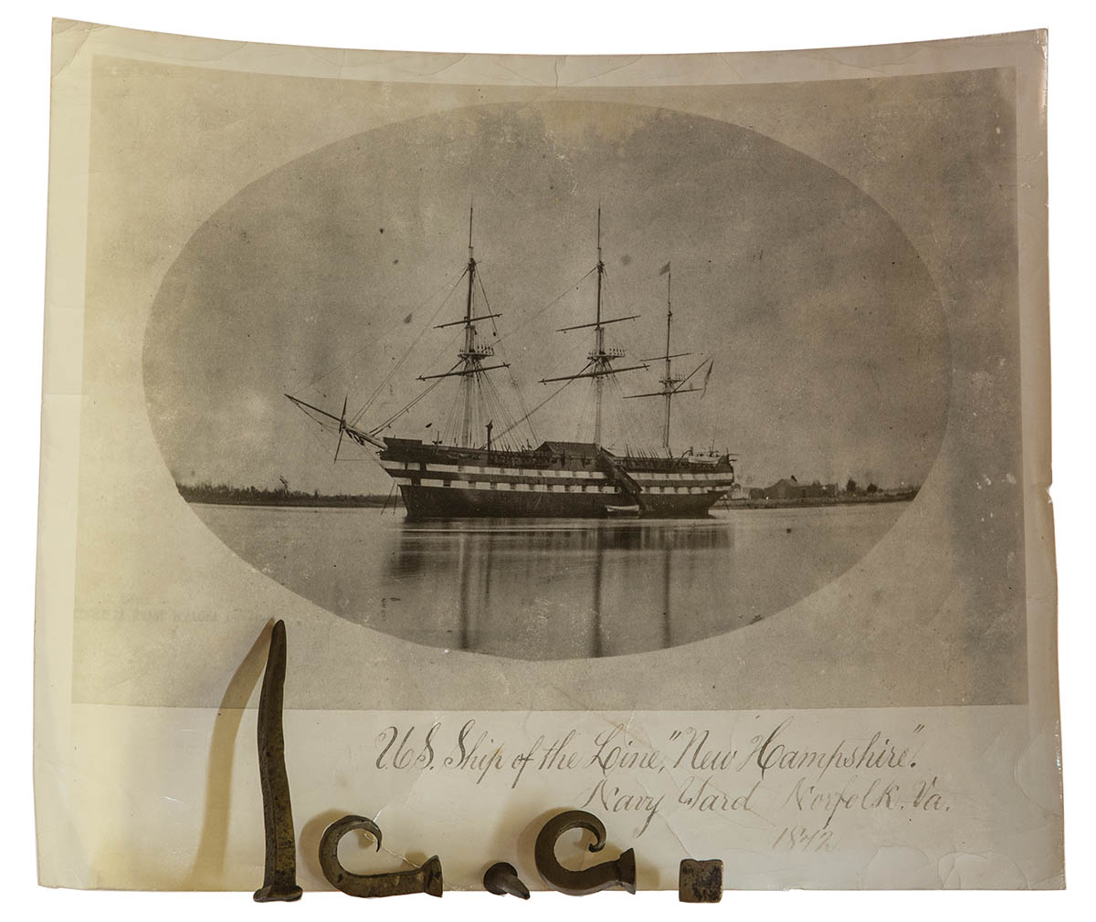 8″ x 10″ photograph, “U.S. Ship of the Line ‘New Hampshire'”, Navy yard, Norfolk, Va, 1842, along with the five brass “Nails from the USS New Hampshire of Manchester By the Sea, Mass. 1961”.