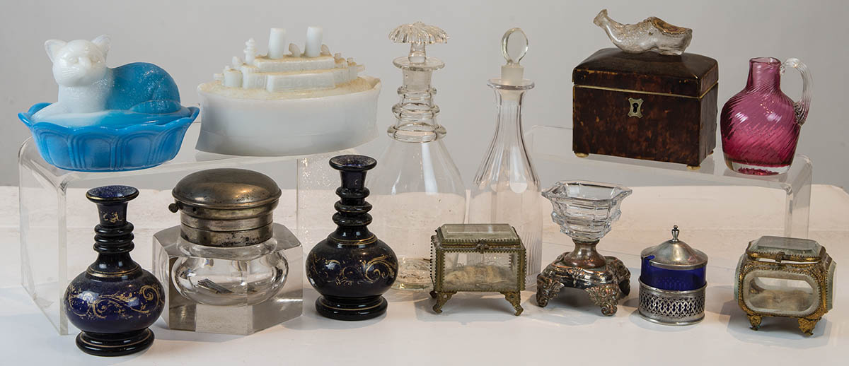 Blue and white milk glass cat on base bowl, white steamship on base, pair of cobalt blue barber bottles with gilt decoration, large flint glass ink stand with silver top, two brass bound clear glass jewelry boxes, mustard shoe for perfume, tortoise lidded box, red/pink swirl creamer, two decanters.