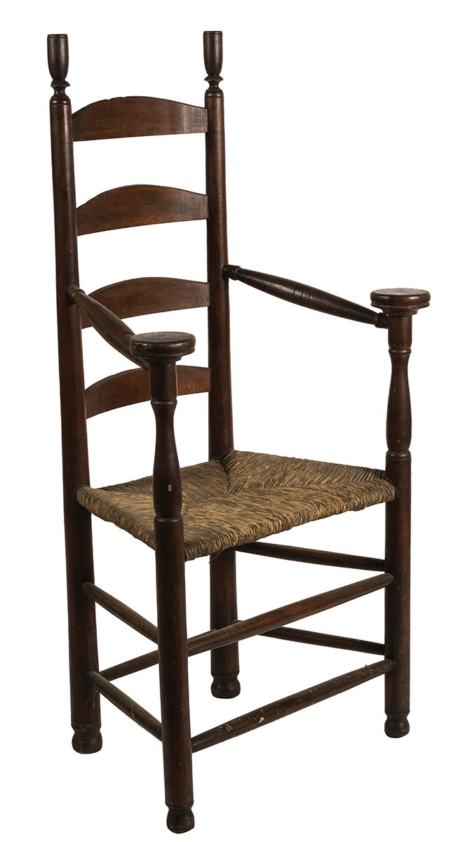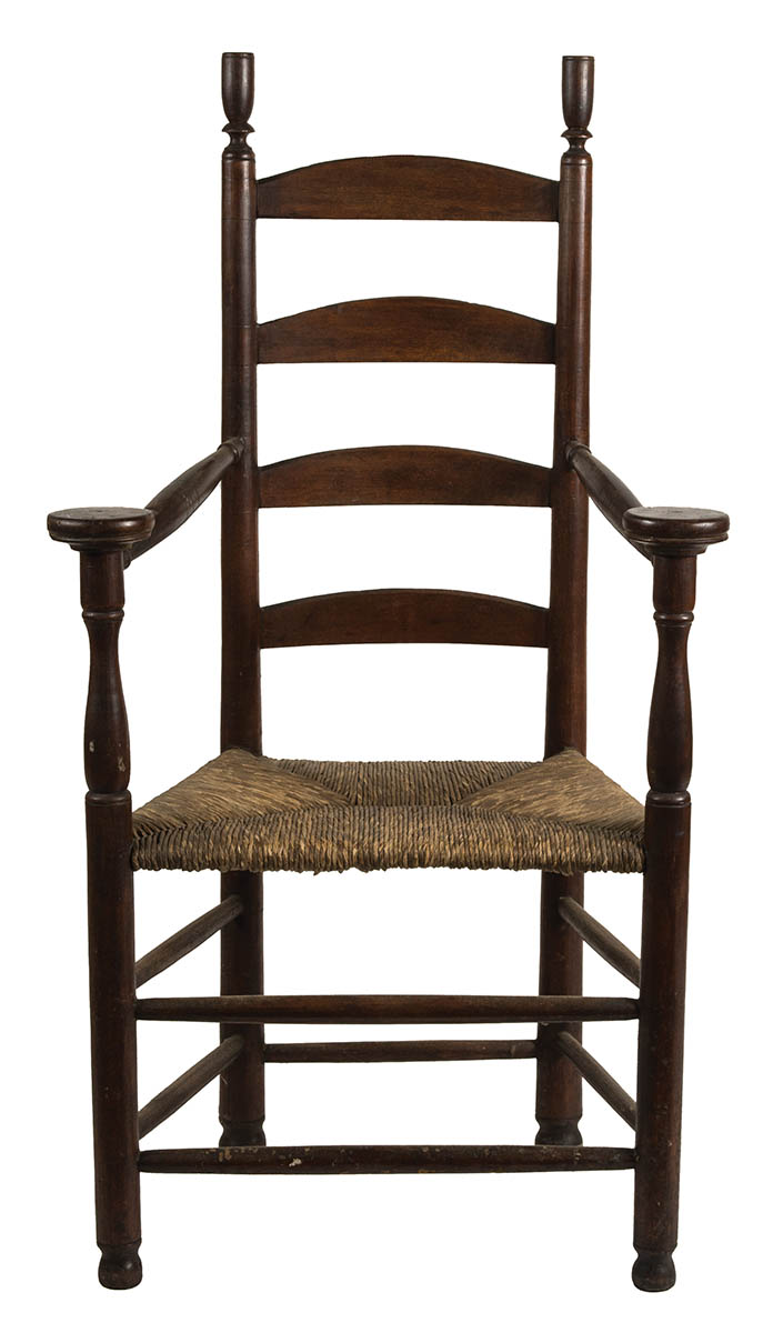 Maple, dark brown stained finish, tall turned finials, canted arms with large pommel shaped ends, turned supports, early rush seat, double boxed stretchers, compressed ball feet, 16 1/2″ seat l, 42 1/2″ overall.