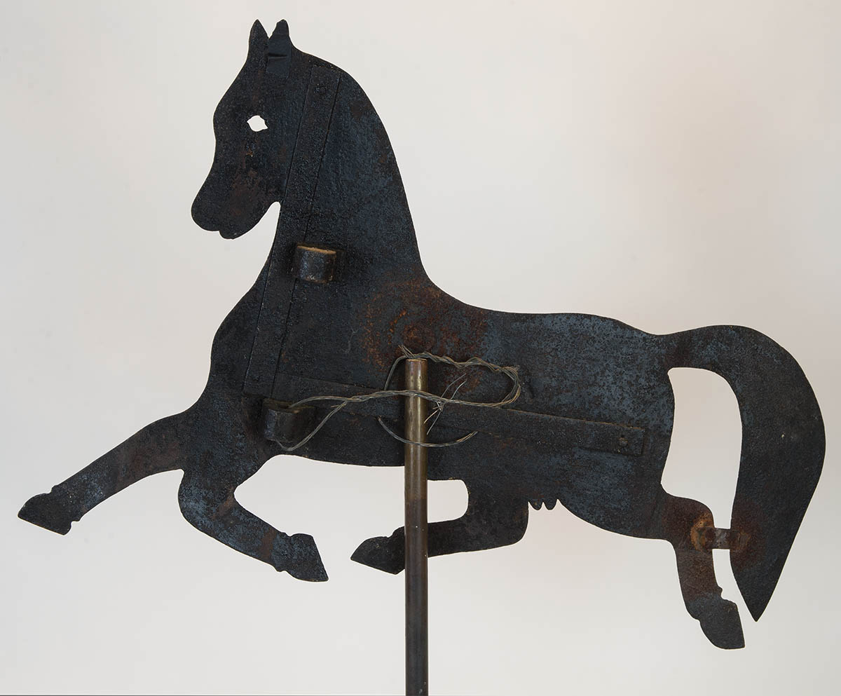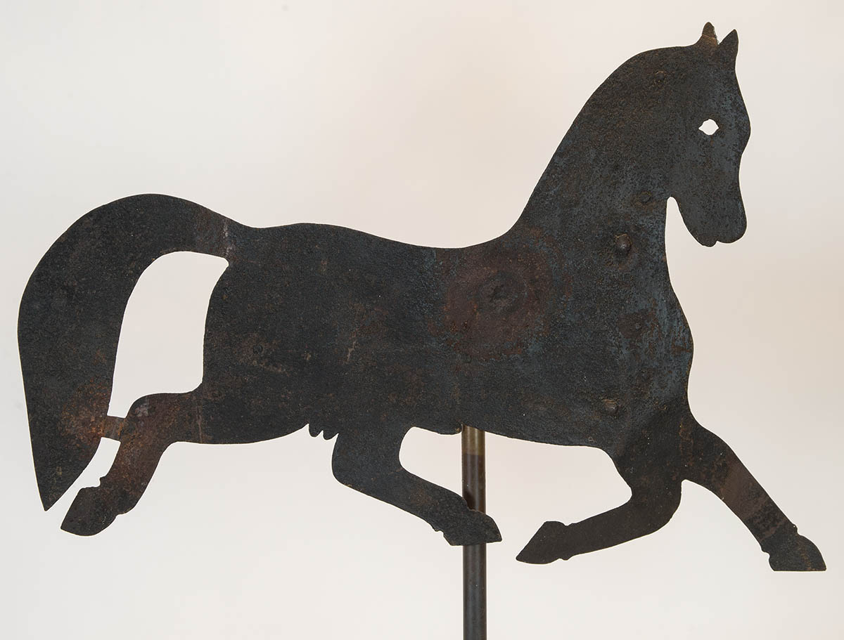 Weathervane of a stallion, dark surface weathered with some rust spots, 18″ h, 27″ l.