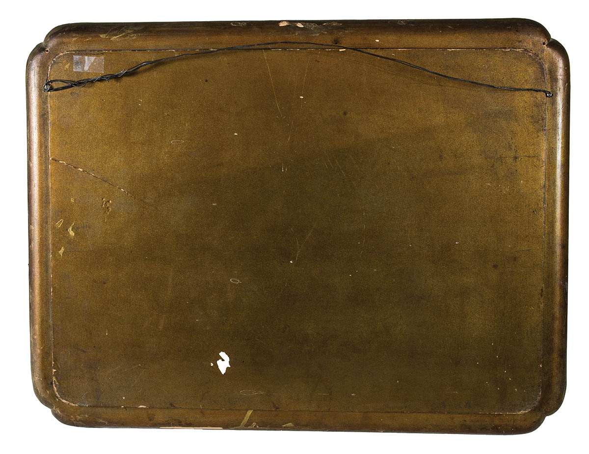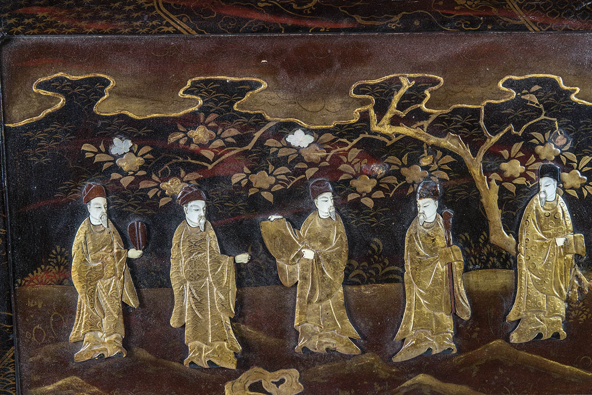 Chippendale style tray, with five elder figures in a garden, finely painted in gold and reds, 20″ h, 27″ w.