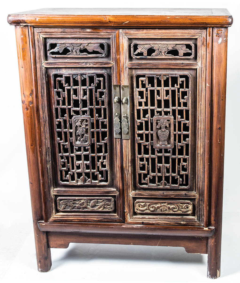 Intricately carved panel doors with inset floral panels, panel sides with rectangular carved panels above, all on rounded feet, 40 1/2″ h, 29″ w, 16 1/2″ d.