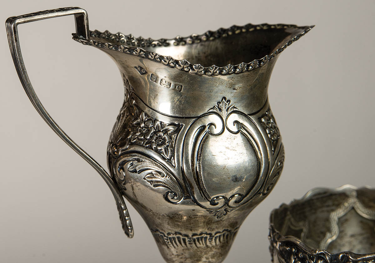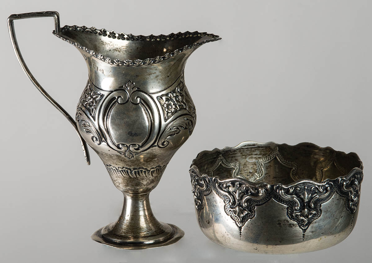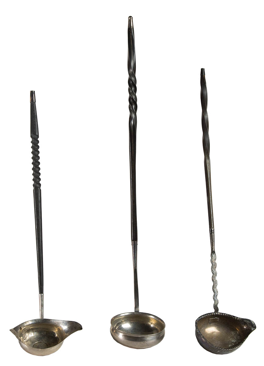 Three punch ladles, (one with inset central coin “Georgius II” portrait), all with twist baleen handles, 13″, 14 1/2″ and 16″ l; Footed creamer with squared handle, hallmarked “S.G”, anchor, rampant lion and “C”, 4″ h; Small bowl, hallmarked with a “boar”, 3 1/2″ dia.