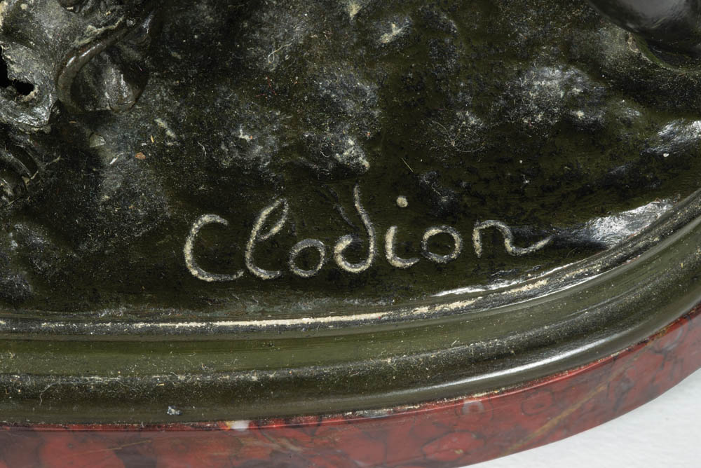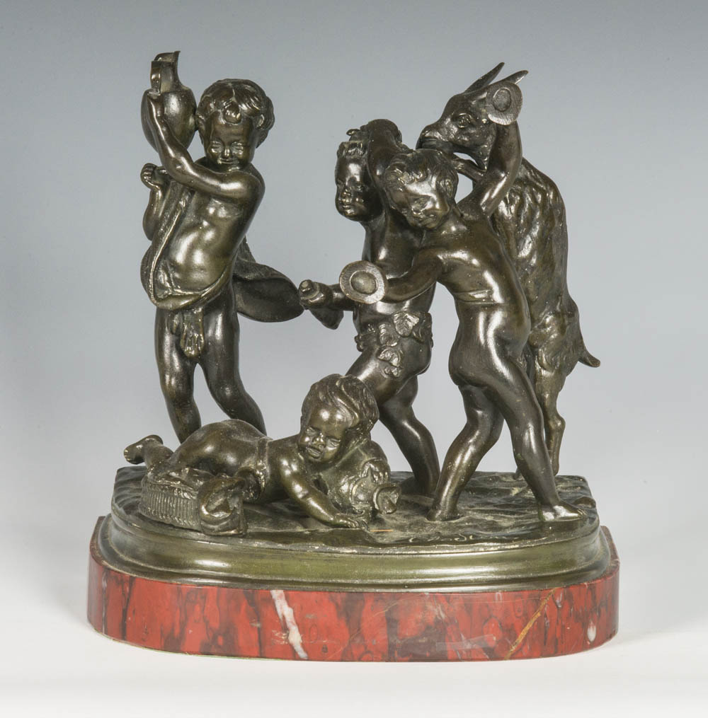 Bacchanal group of four putti and a goat, holding jugs and bottles of wine, signed “Clodion” (Claude Michel Clodion, 1738-1814), on a red marble base, (note: goat is eating one of the figures hair), 7 1/2″ h, 7 3/4″ w.