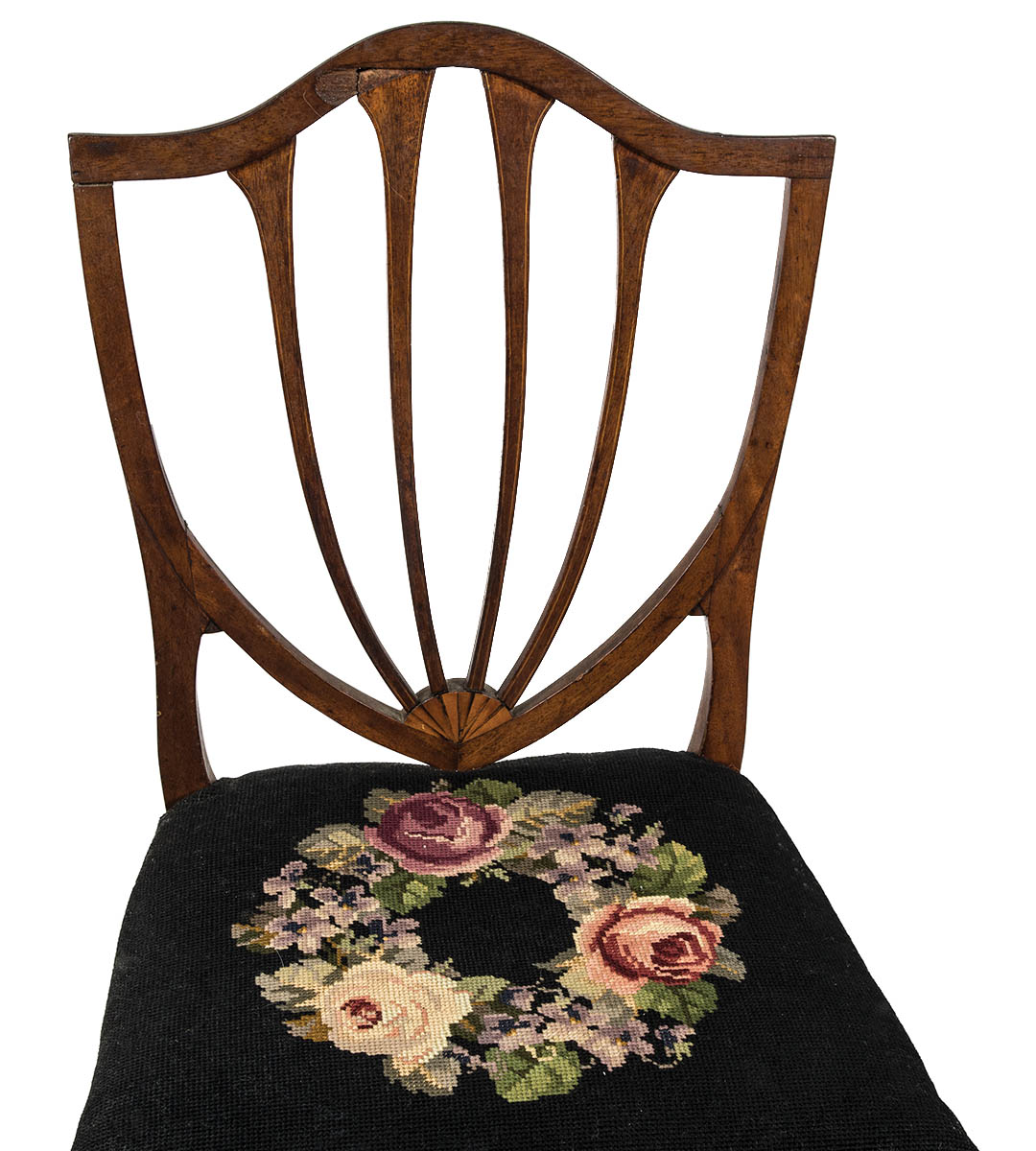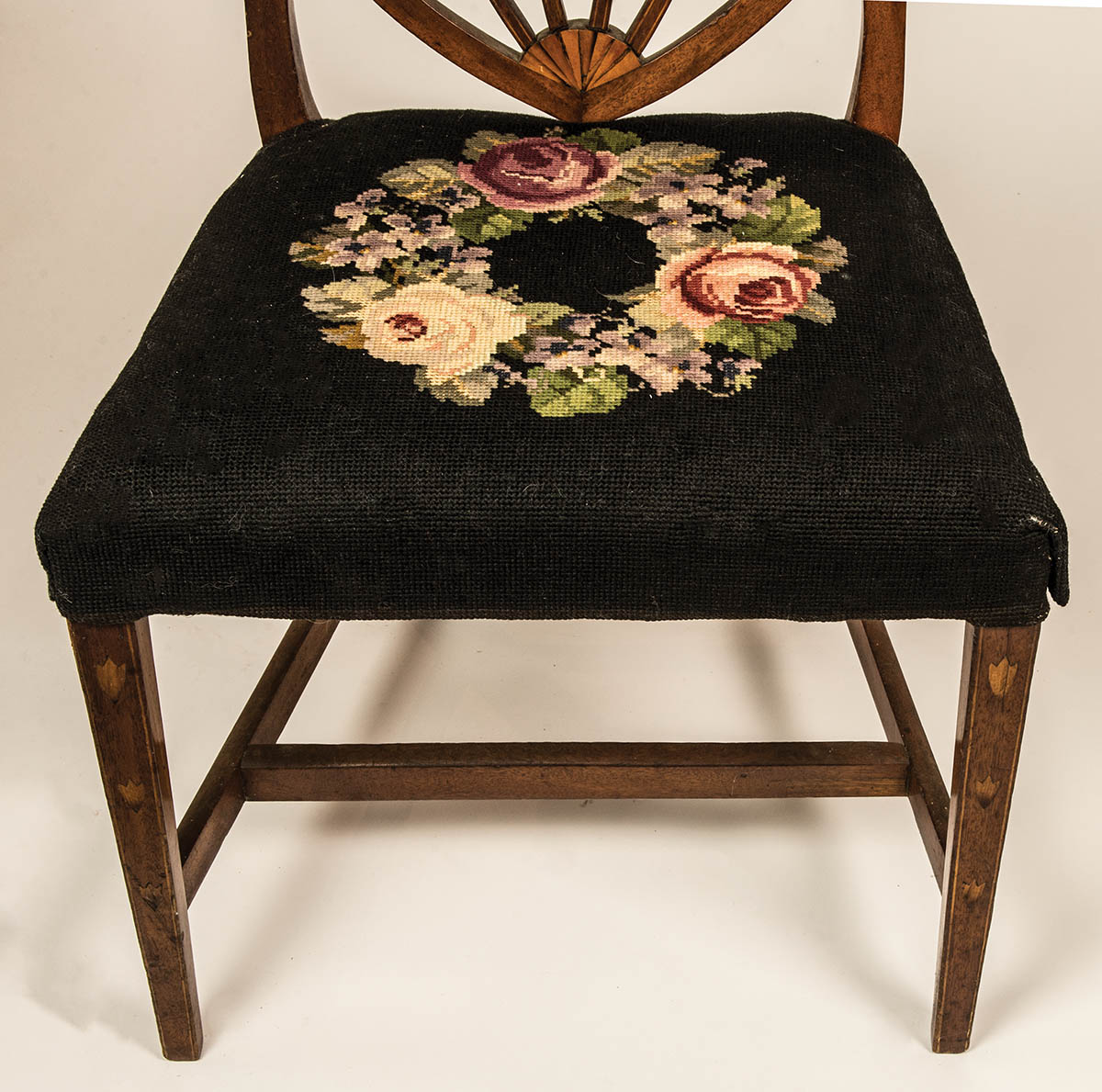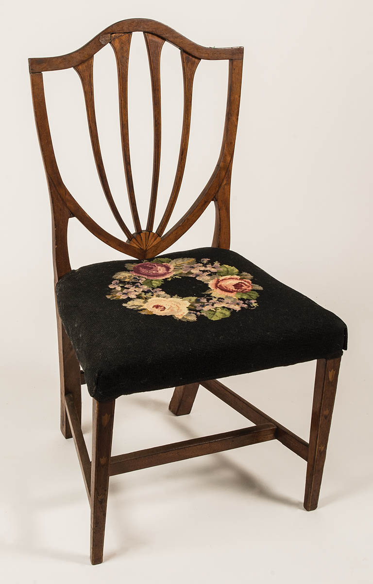 Shield back, inlaid with bell flowers, on square tapered legs, needlepoint seat, small piece missing at top, 17″ seat h, 36″ overall h.