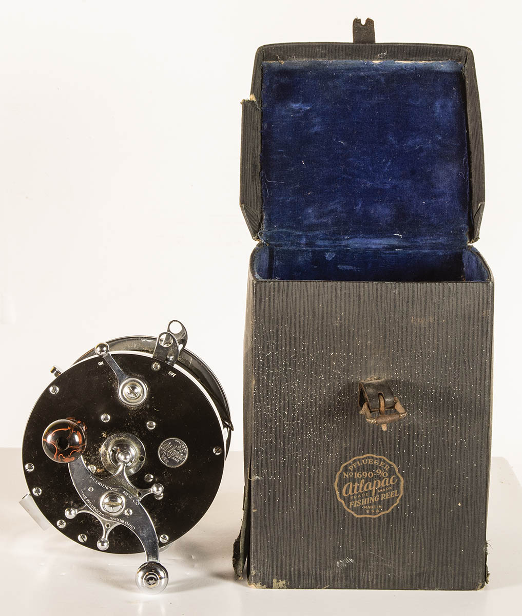 No. 1690, 9/0, “Atlapac”, in original felt bag, and in original black faux leather box, lined in blue velvet, green line, very good condition, found in a Duxbury, MA home, 5 1/2″ h, 5″ w.