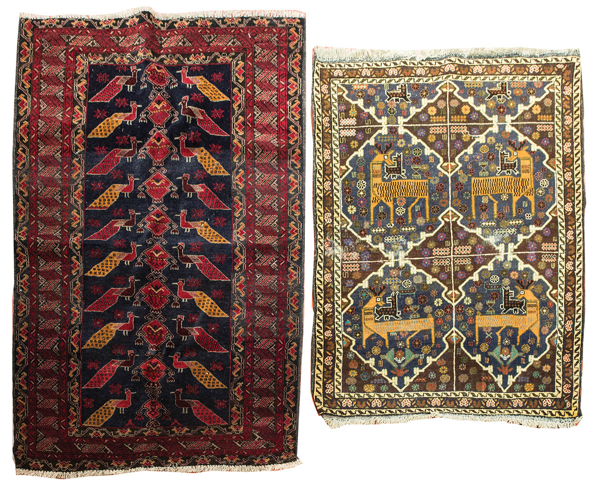 Good quality, Persian, blue field with two rows of peacocks, 5′ 5″ x 3′ 4″; Persian with four deer, in lattice work diamonds, 4′ 3″ x 3′ 2″.