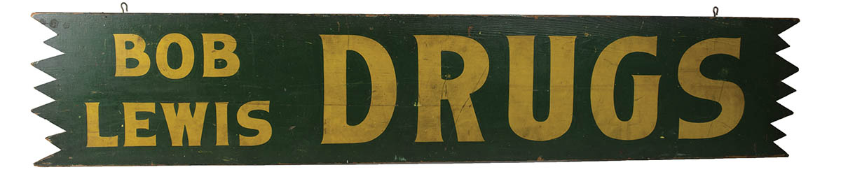 Double sided sign, “Bob Lewis Drugs”, green and yellow, slight in-use wear, scalloped ends, 5′ x 11 1/2″.